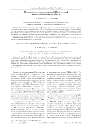 Золотистые водоросли (класс Chrysophyceae, отдел Heterokontophyta) с кремнистыми покровами (чешуйчатые золотистые водоросли) представляют собой группу пресноводных микроорганизмов, играющих существенную роль в водных экосистемах (Siver, 1995; Kristiansen, 2005; Lengyel et al., 2023). Они являются чувствительными индикаторами состояния окружающей среды и при мониторинге могут служить показателями экологических изменений в водоемах (Siver, 1995; Voloshko, 2017). Выявление видового состава представителей данной группы является первым необходимым этапом организации мониторинга для контроля экологических изменений водоемов (Safronova, 2018).
