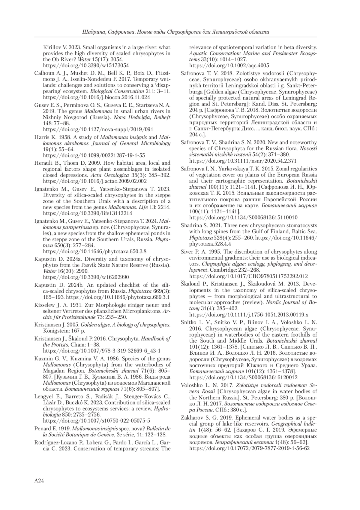 13. Kapustin D. 2024b. An updated checklist of the silica-scaled chrysophytes from Russia. Phytotaxa 669(3): 165-193. DOI: 10.11646/phytotaxa.669.3.1
