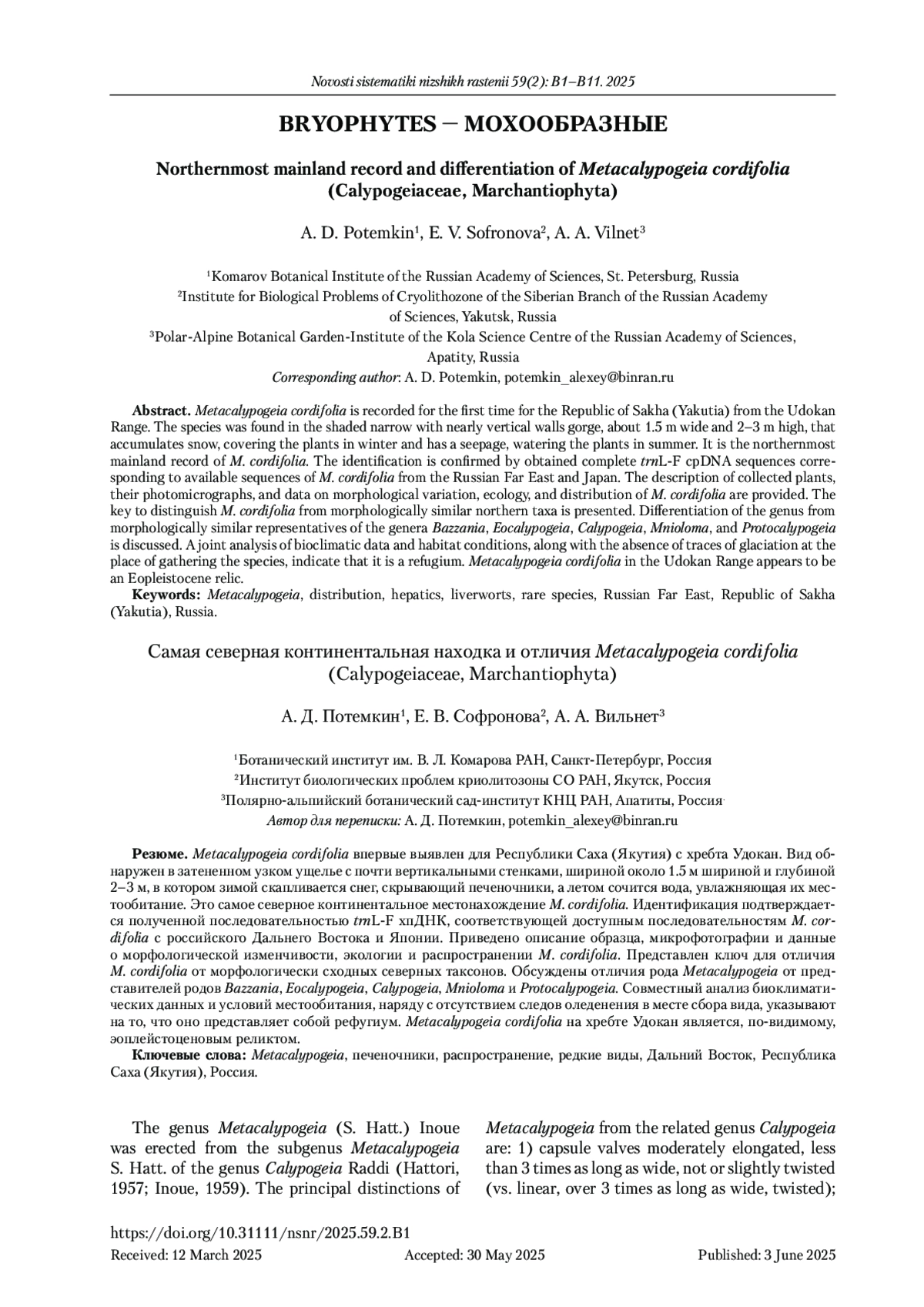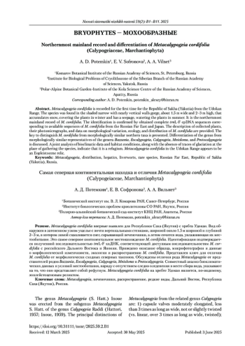 Metaсalypogeia cordifolia впервые выявлен для Республики Саха (Якутия) с хребта Удокан. Вид обнаружен в затененном узком ущелье с почти вертикальными стенками, шириной около 1.5 м шириной и глубиной 2–3 м, в котором зимой скапливается снег, скрывающий печеночники, а летом сочится вода, увлажняющая их местообитание. Это самое северное континентальное местонахождение M. сordifolia. Идентификация подтверждается полученной последовательностью trnL-F хпДНК, соответствующей доступным последовательностям M. cordifolia с российского Дальнего Востока и Японии. Приведено описание образца, микрофотографии и данные о морфологической изменчивости, экологии и распространении M. cordifolia. Представлен ключ для отличия M. cordifolia от морфологически сходных северных таксонов. Обсуждены отличия рода Metacalypogeia от представителей родов Bazzania, Eocalypogeia, Calypogeia, Mnioloma и Protocalypogeia. Совместный анализ биоклиматических данных и условий местообитания, наряду с отсутствием следов оледенения в месте сбора вида, указывают на то, что оно представляет собой рефугиум. Мetacalypogeia cordifolia на хребте Удокан является, по-видимому, эоплейстоценовым реликтом.