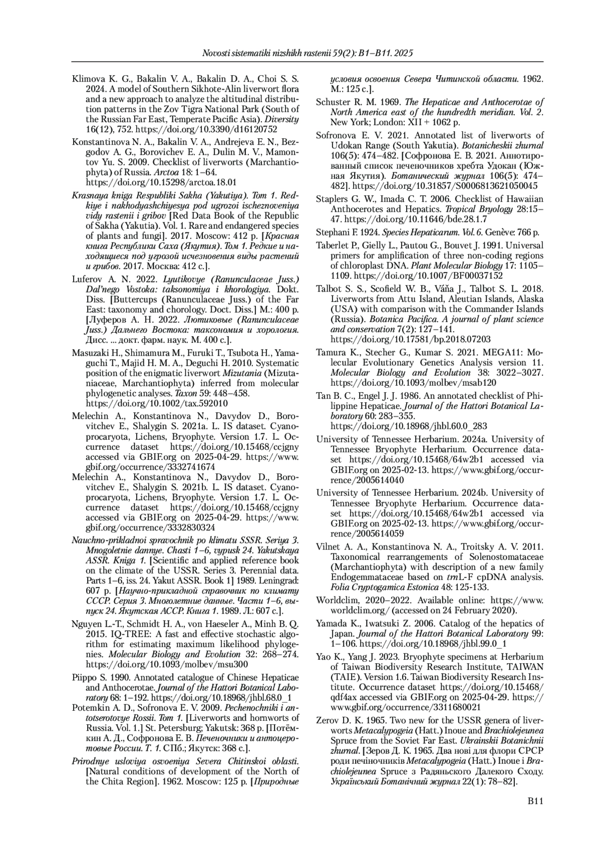 7. Bakalin V. A., Klimova K. G., Nguen V. S., Bakalin D. A., Choi S. S. 2021b. Liverwort oil body diversity in Pacific Asia. Arctoa 30: 219-346. DOI: 10.15298/arctoa.30.22