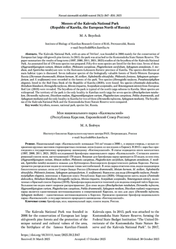 4. Boychuk M. A. 2021. Mosses (Bryophyta) of the Kostomuksha State Nature Reserve, Russia. Nature Conservation Research 6 (Suppl. 1): 89-97. DOI: 10.24189/ncr.2021.018