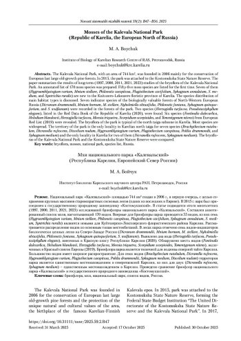 Национальный парк «Калевальский» площадью 744 км2 создан в 2006 г., в первую очередь, с целью сохранения крупных массивов старовозрастных сосновых лесов (одних из последних в Европе). В 2015 г. парк был присоединен к государственному природному заповеднику «Костомукшский». В статье подводятся итоги многолетних (1997, 2000, 2011, 2021, 2023) исследований бриофлоры национального парка «Калевальский». Составлен аннотированный список мхов, насчитывающий 170 видов. Впервые для бриофлоры парка приводится 55 видов, из них семь (Hygroamblystegium varium, Mnium stellare, Philonotis caespitosa, Plagiothecium cavifolium, Sphagnum annulatum, S. medium, Syntrichia ruralis) являются новыми для Куйтозерско-Лексозерского флористического района Карелии. Рассматривается распределение видов по основным типам местообитаний. В лесах парка отмечено cемь видов-индикаторов биологически ценных лесов на Cеверо-Западе России (Dicranum drummondii, Mnium hornum, M. stellare, Nyholmiella obtusifolia, Philonotis fontana, Sphagnum quinquefarium, S. wulfianum). Выявлено два вида (Herzogiella turfacea, Pseudotaxiphyllum elegans), внесенных в Красную книгу Республики Карелия (2020). Обнаружено шесть видов (Fontinalis dalecarlica, Helodium blandowii, Herzogiella turfacea, Meesia triquetra, Scorpidium scorpioides, Tomentypnum nitens), включенных в Красный список Европы (2019). Бриофлора парка является типичной для подзоны северной тайги Карелии. Большинство видов имеет широкое распространение. Для семи видов (Brachythecium rutabulum, Dicranella rufescens, Hygroamblystegium varium, Plagiothecium caespitosa, Pohlia drummondii, Sphagnum medium, Discelium nudum) территория парка является единственным местонахождением в северотаежной Карелии, из них для двух (Dicranella rufescens, Sphagnum medium) – единственным местонахождением в Карелии. Проведено сравнение бриофлор национального парка «Калевальский» и государственного природного заповедника «Костомукшский».