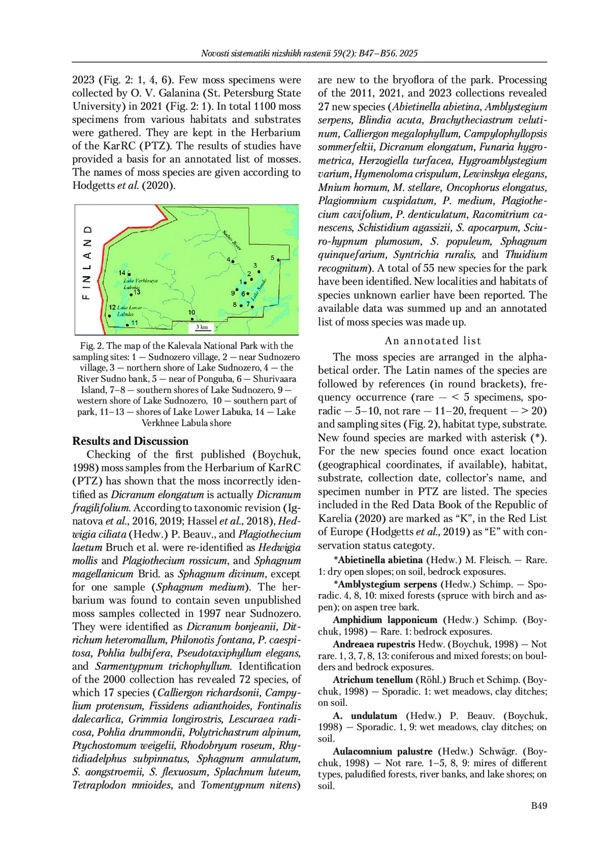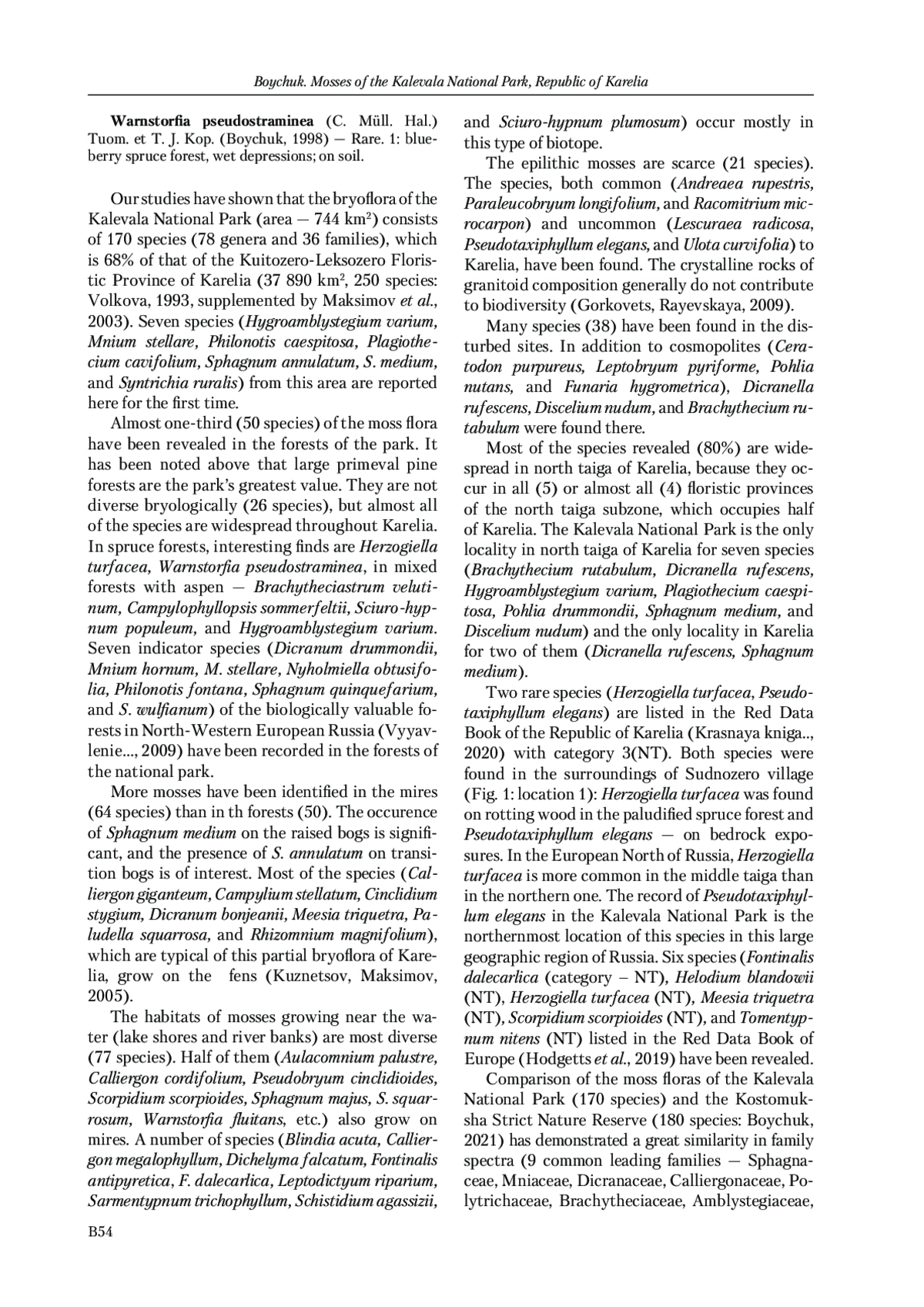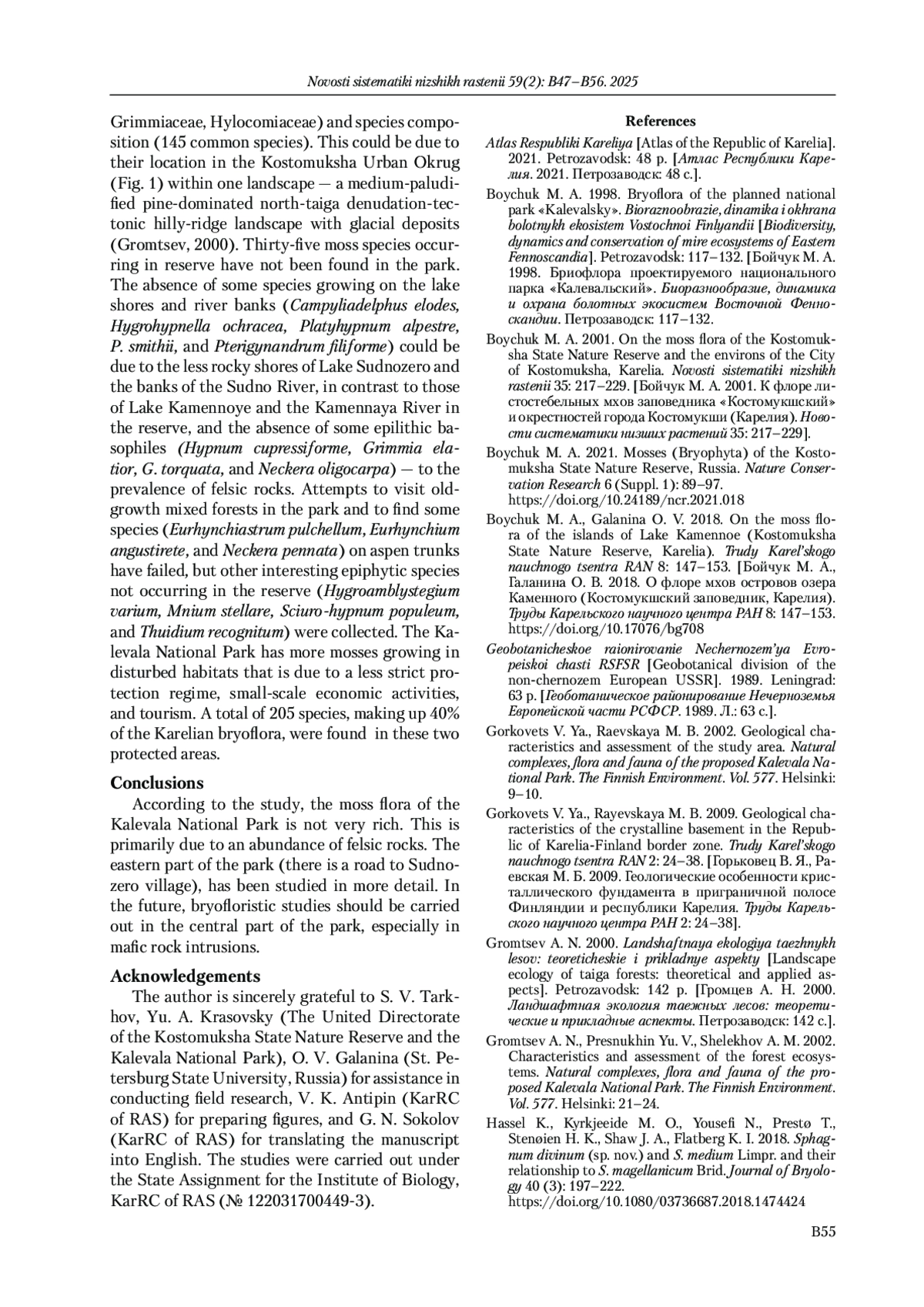 2. Boychuk М. А. 1998. Bryoflora of the planned national park “Kalevalsky”. Bioraznoobrazie, dinamika i okhrana bolotnykh ekosistem Vostochnoi Finlyandii [Biodiversity, dynamics and conservation of mire ecosystems of Eastern Fennoscandia]. Petrozavodsk: 117-132. [Бойчук М. А. 1998. Бриофлора проектируемого национального парка “Калевальский”. Биоразнообразие, динамика и охрана болотных экосистем Восточной Фенноскандии. Петрозаводск: 117-132.