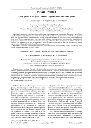 14. Moroz E. L., Gmoshinskiy V. I., Shchepin O. N., Novozhilov Yu. K. 2024. The Systematics and Phylogeny of Myxomycetes: Yesterday, Today, and Tomorrow. Doklady Biological Sciences 519: 356-369. DOI: 10.1134/S0012496624701242