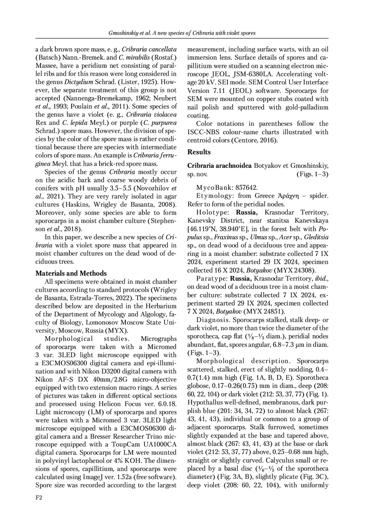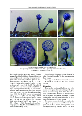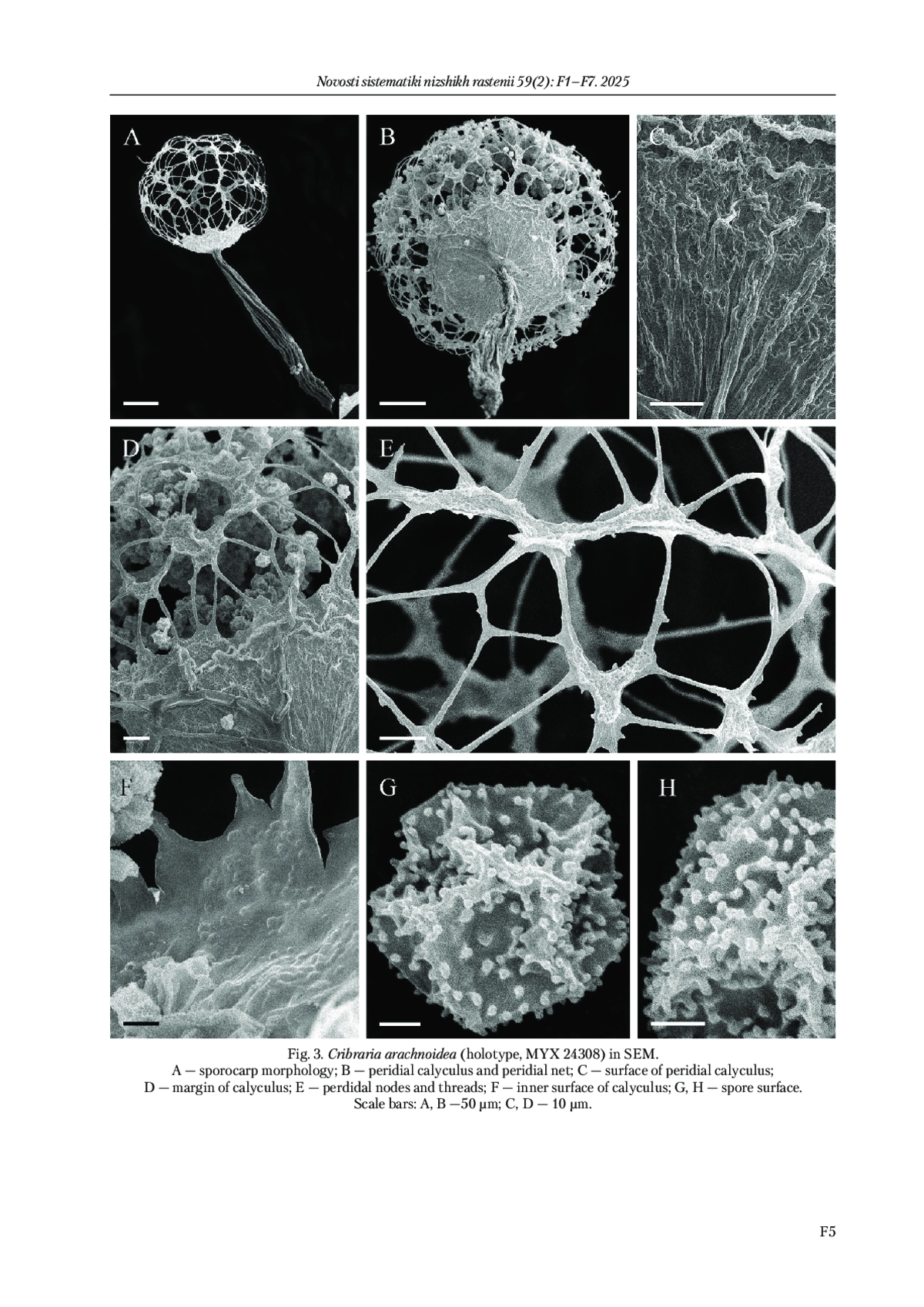 Новый вид рода Cribraria — С. arachnoidea выявлен методом влажных камер на валеже лиственных деревьев, собранном на юге европейской части России (станица Каневская, Краснодарский край). Спорокарпы и споры исследованы методами световой и сканирующей электронной микроскопии. Основные диагностические признаки Cribraria arachnoidea — насыщенно-фиолетовый цвет небольших спорокарпов, достаточно короткая и не превышающая двух диаметров споротеки ножка, маленькая чашечка, уплощенные неправильной формы узелки сети перидия и угловатые споры. Представлены микрофотографии всех определительных признаков.