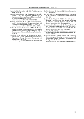 21. Стивенсон И Др. Л., Новожилов Ю. К., Уэллман П. 2018. Новый вид Cribraria (миксомицетов) из Австралии. Новости систематики низших растений 52 (2): 379-385. DOI: 10.31111/nsnr/2018.52.2.379