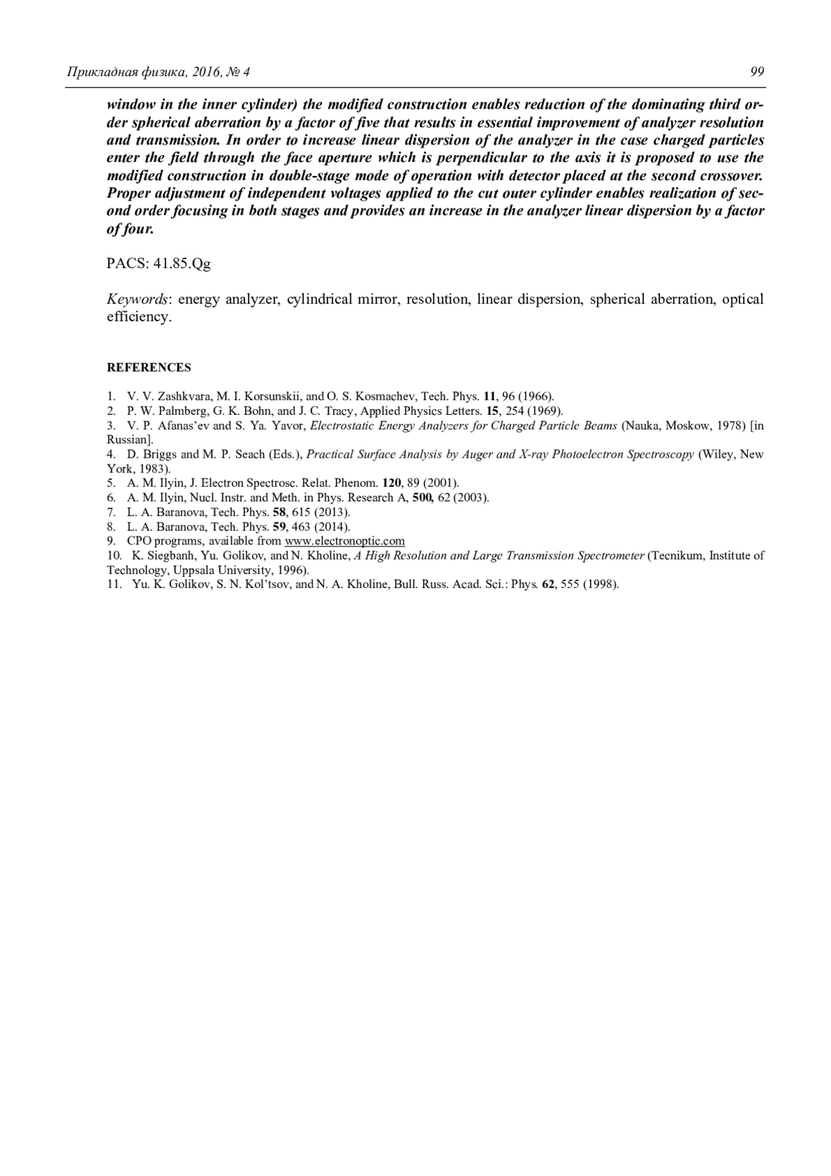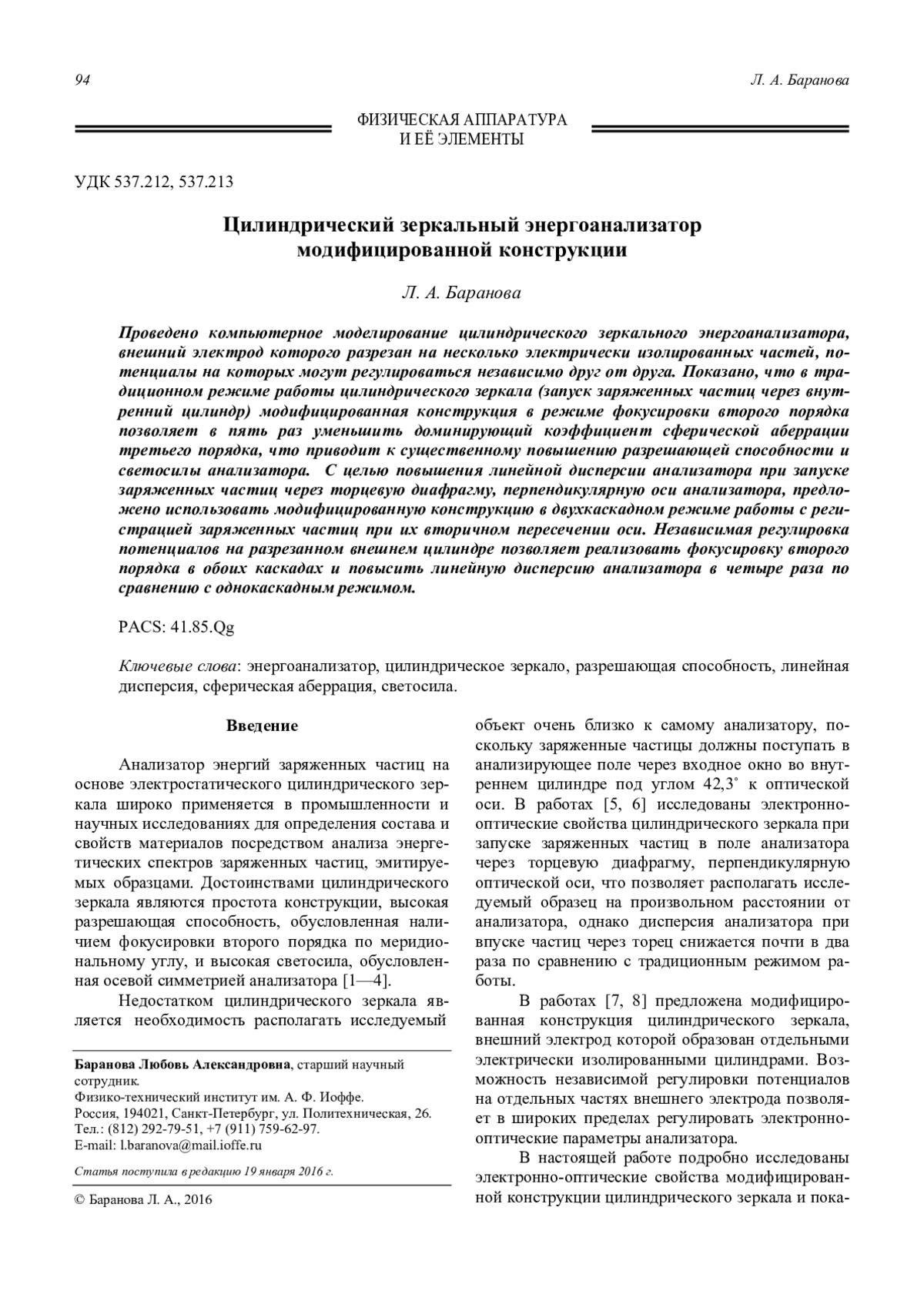 Баранова Л. А. Цилиндрический зеркальный энергоанализатор модифицированной конструкции 94