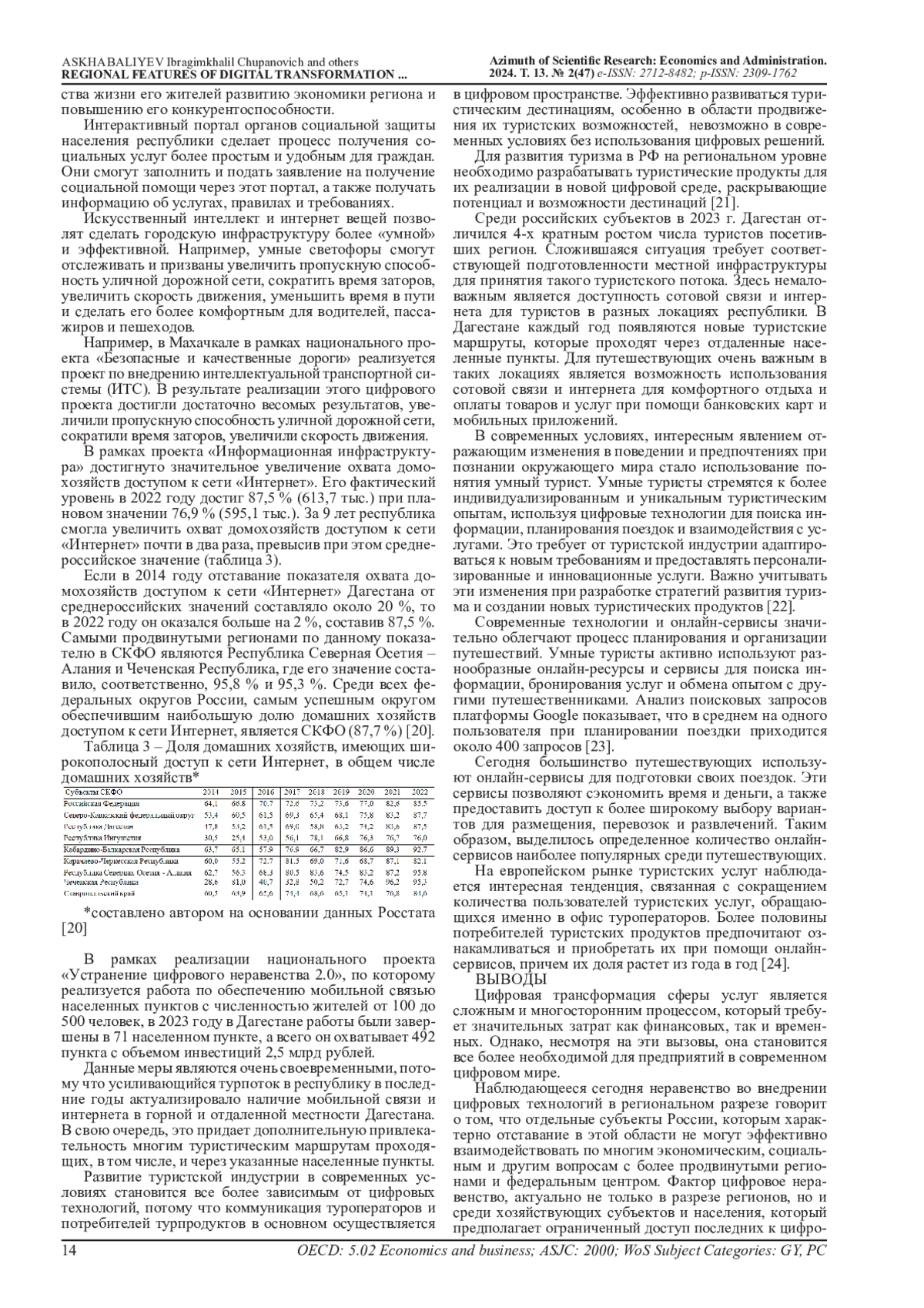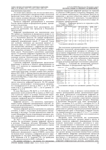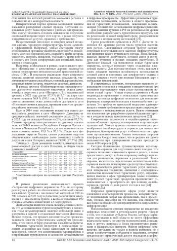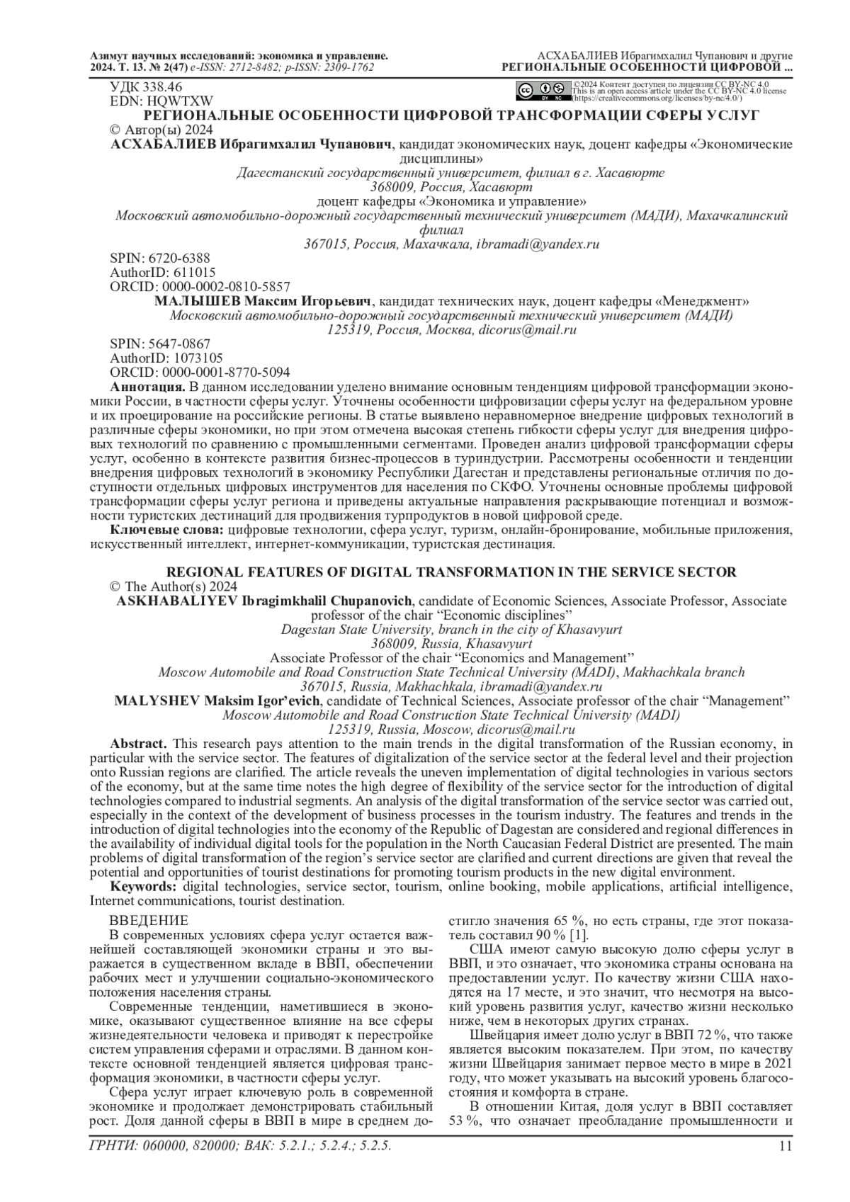 В данном исследовании уделено внимание основным тенденциям цифровой трансформации экономики России, в частности сферы услуг. Уточнены особенности цифровизации сферы услуг на федеральном уровне и их проецирование на российские регионы. В статье выявлено неравномерное внедрение цифровых технологий в различные сферы экономики, но при этом отмечена высокая степень гибкости сферы услуг для внедрения цифровых технологий по сравнению с промышленными сегментами. Проведен анализ цифровой трансформации сферы услуг, особенно в контексте развития бизнес-процессов в туриндустрии. Рассмотрены особенности и тенденции внедрения цифровых технологий в экономику Республики Дагестан и представлены региональные отличия по доступности отдельных цифровых инструментов для населения по СКФО. Уточнены основные проблемы цифровой трансформации сферы услуг региона и приведены актуальные направления раскрывающие потенциал и возможности туристских дестинаций для продвижения турпродуктов в новой цифровой среде.