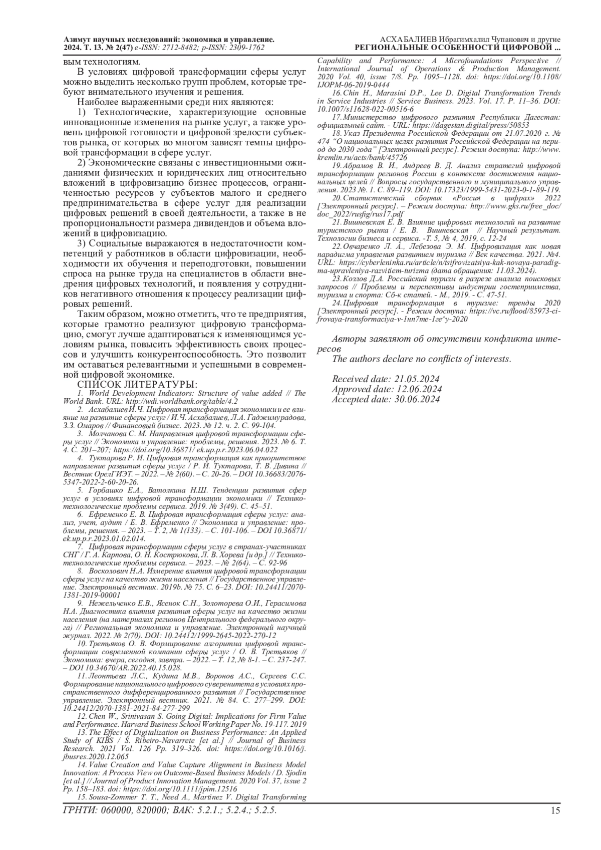 1. World Development Indicators: Structure of value added // The World Bank. URL: http://wdi.worldbank.org/table/4.2 (дата обращения: 10.03.2024). 2. Асхабалиев, И.Ч. Цифровая трансформация экономики и ее влияние на развитие сферы услуг / И.Ч. Асхабалиев, Л.А. Гаджимурадова, З.З. Омаров // Финансовый бизнес. 2023. № 12. ч. 2. С. 99-104. EDN: FZROXX