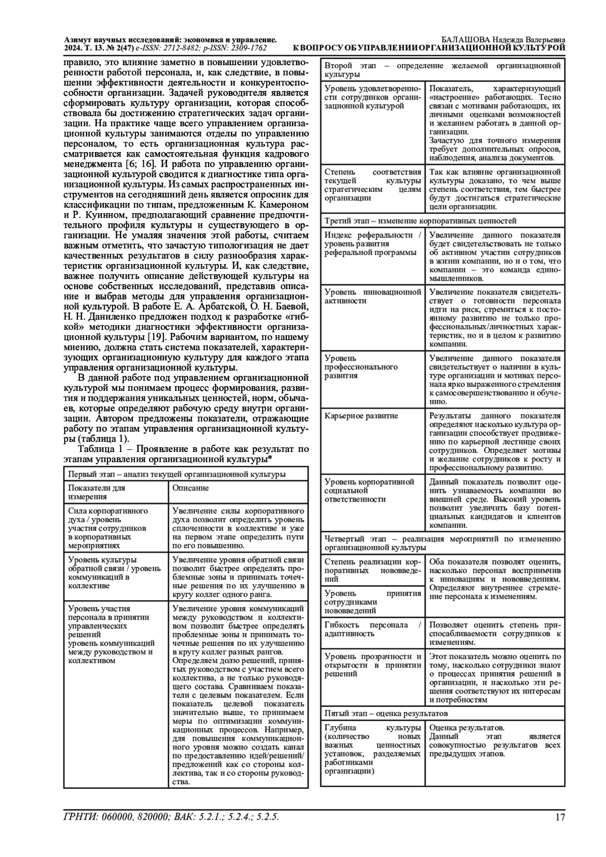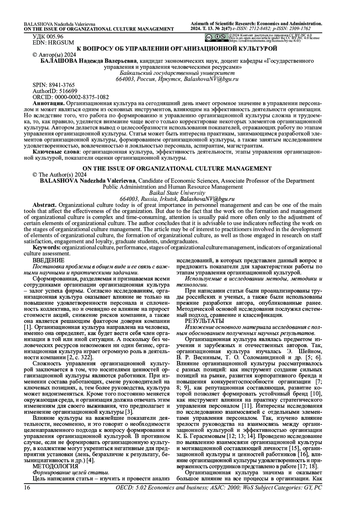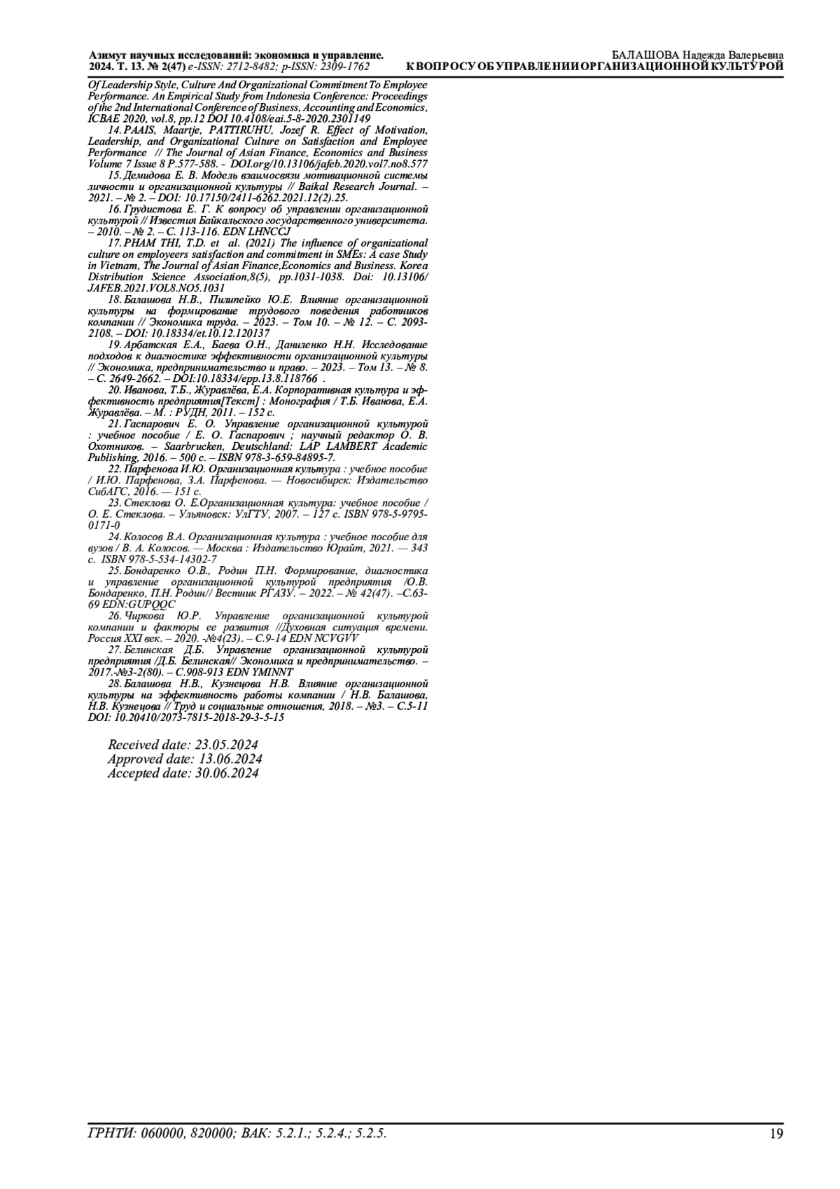 12. Герасимов К.Б. Влияние организационной культуры на эффективность деятельности Основы экономики, управления и права.2023. - №1(36). С.43-49. DOI: 10.51608/23058641_2023_1_43 EDN: HBESJB