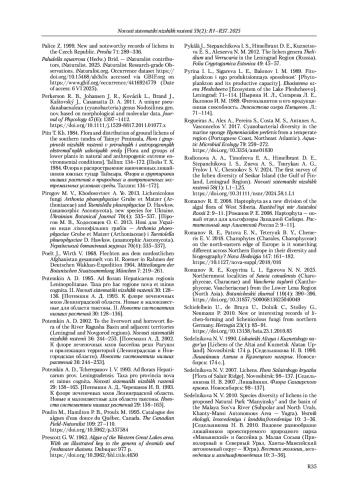 12. Бессудова А. Ю. Л. Сороковикова M., Томберг Дж. V., Лихошвей Е. V. 2018. Покрытые кремнеземной чешуей хризофиты в крупных притоках озера Байкал. Криптогамия, альгология 39 (2): 145-165. DOI: 10.7872/crya/v39.iss2. 2018. 145