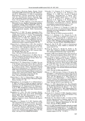 155. Urbanavichus G. P. 2014. Additions to the lichen flora of Murmansk Province. Byulleten’ Moskovskogo obshchestva ispytatelei prirody. Otdel biologicheskii 119(3): 77. [Урбанавичюс Г. П. 2014. Дополнения к лихенофлоре Мурманской области. Бюллетень Московского общества испытателей природы. Отдел биологический 119(3): 77].
