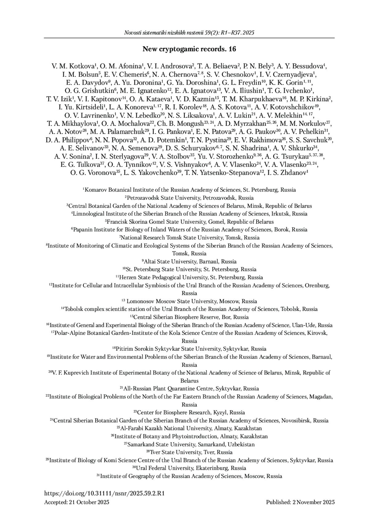 75. Шевченко В. М., Афонина О. М., Беляков Е. А., Захаров К. А., Болсун И. М., Давыдов Е. А., Дорошина Г. Я., Дьяченко А. П., Ерошкина О. В., Филиппова Н. В. ил. 2025. Новые криптографические записи. 15. Новости систематики низших изменений 59(1): R1-R26. DOI: 10.31111 / nsnr/2025.59.1.R1