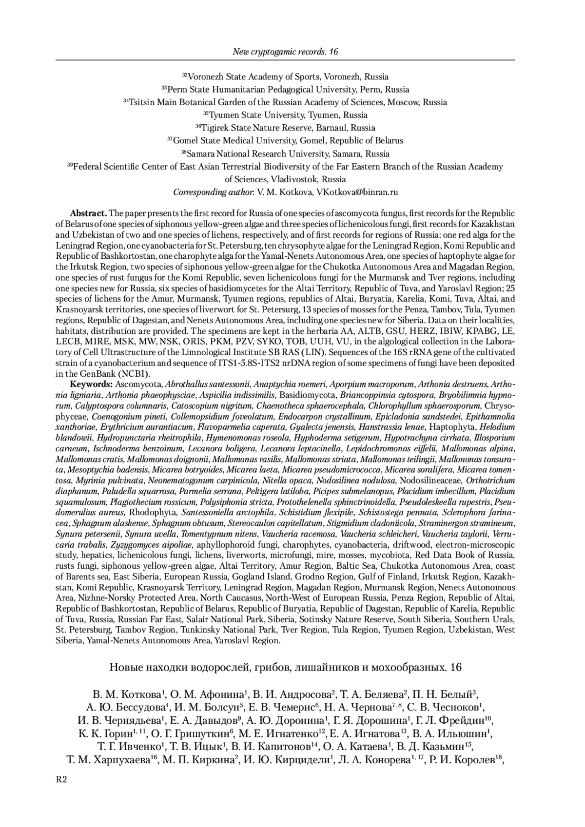 Приведены первое указание для России одного вида микромицетов, первые указания для Республики Беларусь одного вида сифоновых желтозеленых водорослей и трех видов лихенофильных грибов, первые указания для Казахстана и Узбекистана двух и одного видов лишайников, соответственно, а также первые указания для регионов России: одного вида красных водорослей для Ленинградской обл., одного вида цианобактерии для Санкт-Петербурга, десяти видов золотистых водорослей для Ленинградской обл., республик Башкортостан и Коми, одного вида харовых водорослей для Ямало-Ненецкого автономного округа, одного вида гаптофитовой водоросли для Иркутской обл., двух видов сифоновых желтозеленых водорослей для Чукотского автономного округа и Магаданской обл., одного вида ржавчинного гриба для Республики Коми, семи видов лихенофильных грибов для Мурманской и Тверской областей, включая 1 вид новый для России, шести видов базидиальных грибов для Алтайского края, Республики Тыва и Ярославской обл., 25 видов лишайников для Амурской, Мурманской, Тюменской областей, республик Алтай, Бурятия, Карелия, Коми, Алтайского и Красноярского краев, одного вида печеночников для Санкт-Петербурга, 13 видов мхов для Пензенской, Тамбовской, Тульской, Тюменской областей, Республики Дагестан и Ненецкого автономного округа, включая один новый для Сибири вид. В аннотациях к каждому виду приведены сведения о новых местонахождениях, местообитаниях и распространении. Находки подтверждены образцами, хранящимися в гербариях AA, ALTB, GSU, HERZ, IBIW, KPABG, LE, LECB, MIRE, MSK, MW, NSK, ORIS, PKM, PZV, TOB, SYKO, UUH, VU, в альгологической коллекции лаборатории ультраструктуры клетки Лимнологического института СО РАН (LIN). Последовательности 16S РНК образцов культивированного штамма цианобактерии и ITS1-5.8S-ITS2 ярДНК некоторых образцов грибов депонированы в международную базу данных GenBank (NCBI).
