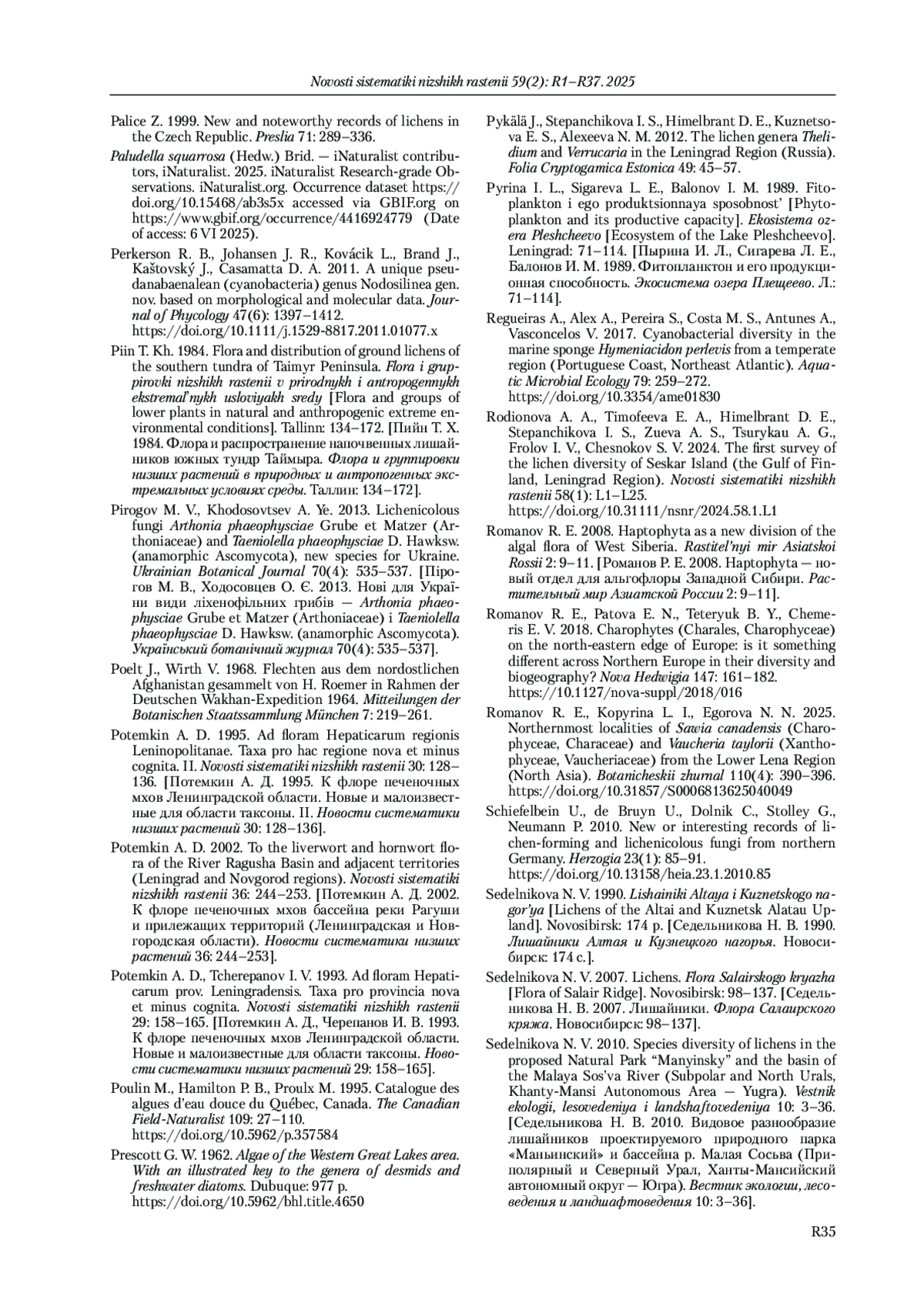 54. Игнатенко М. Е., Яценко-Степанова Т. Н., Миндолина-Младшая.В., Насырова М. А. 2024. Вклад во флору кремнеземистых ступенчатых хризофитов (Chrysophyceae: Chromulinalales, Paraphysomonadales) водоемов степной зоны Южного Урала (Оренбургская область, Россия). Ботанический журнал 109 (5): 484-501. [Игнатенко М. Е., Яценко-Цепанова Т. Н., Миндолина Ю. В., Насырова М. А. 2024. К флоре золотистых водянистых (Хризофицовые: Хромулинальные, Парафизомонадальные) водянистых стенок (Оренбургская область, Россия). Ботанический журнал 109(5): 484-501]. DOI: 10.31857/S0006813624050069