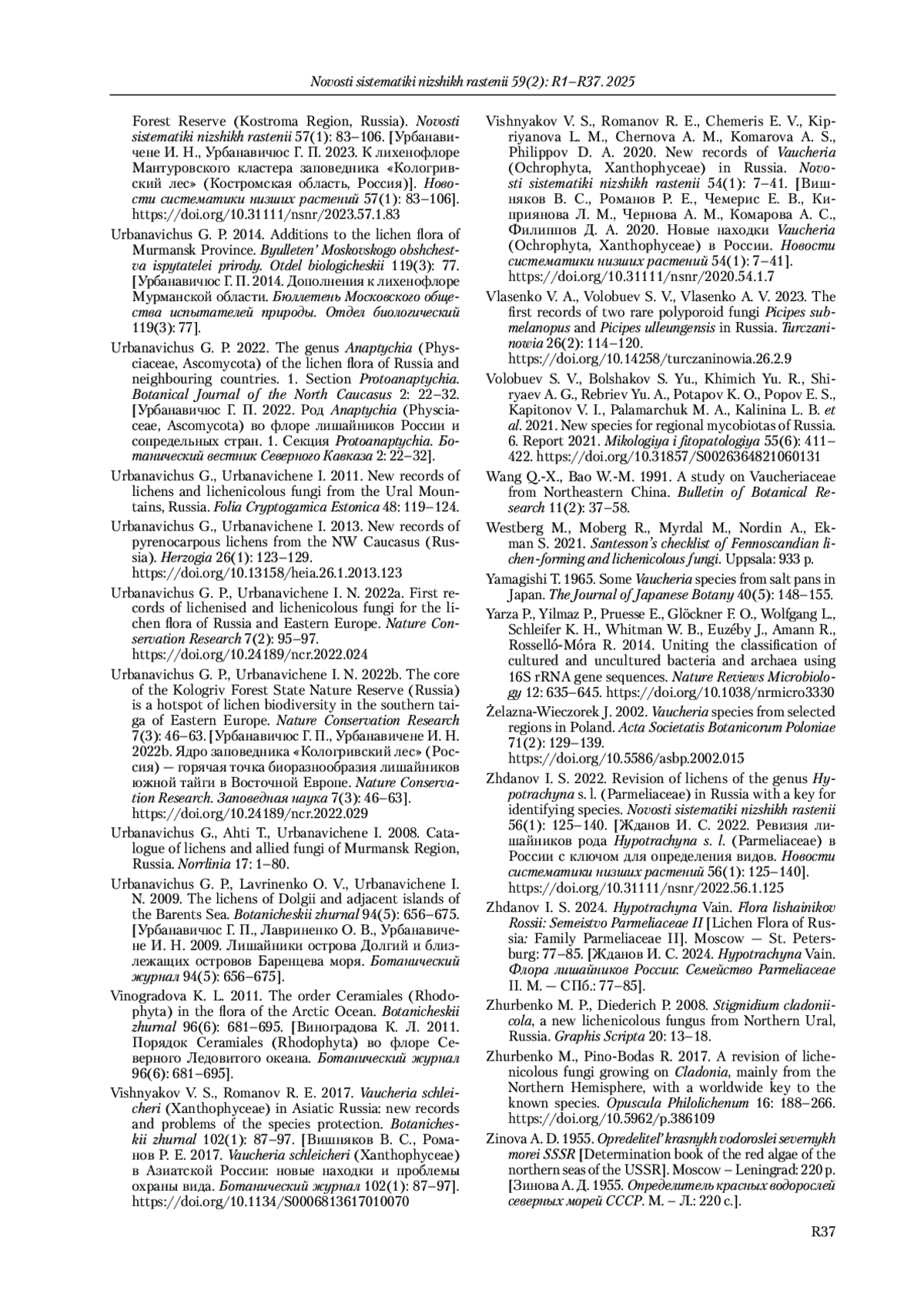 154. Urbanavichene I. N., Urbanavichus G. P. 2023. To the lichen flora of the Manturovskii cluster of the Kologriv Forest Reserve (Kostroma Region, Russia). Novosti sistematiki nizshikh rastenii 57(1): 83-106. [Урбанавичене И. Н., Урбанавичюс Г. П. 2023. К лихенофлоре Мантуровского кластера заповедника “Кологривский лес” (Костромская область, Россия)]. Новости систематики низших растений 57(1): 83-106]. DOI: 10.31111/nsnr/2023.57.1.83
