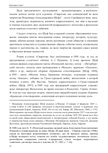 Статья посвящена изучению ценностных аспектов архетипического в русской словесности мотива пути как доминантного в наследии поэта Серебряного века В. А. Шуфа (1865-1913) на примере романа в стихах «Сварогов» (1898) - романа, наследующего жанровые традиции романов в стихах А. С. Пушкина и Я. П. Полонского и являющегося, по сути, «энциклопедией русской жизни» рубежа XIX-XX веков.