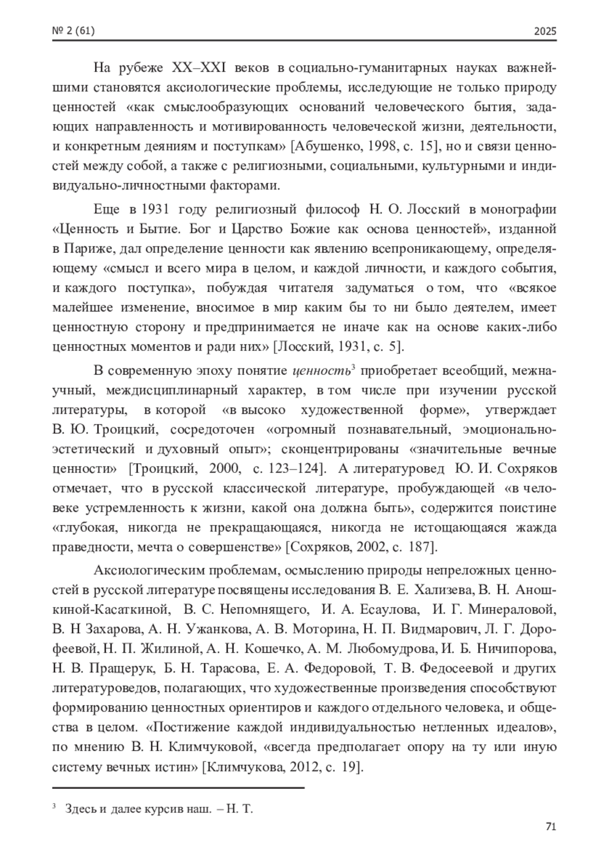 На рубеже XX–XXI веков в социально-гуманитарных науках важнейшими становятся аксиологические проблемы, исследующие не только природу ценностей «как смыслообразующих оснований человеческого бытия, задающих направленность и мотивированность человеческой жизни, деятельности, и конкретным деяниям и поступкам» [Абушенко, 1998, с. 15], но и связи ценностей между собой, а также с религиозными, социальными, культурными и индивидуально-личностными факторами.