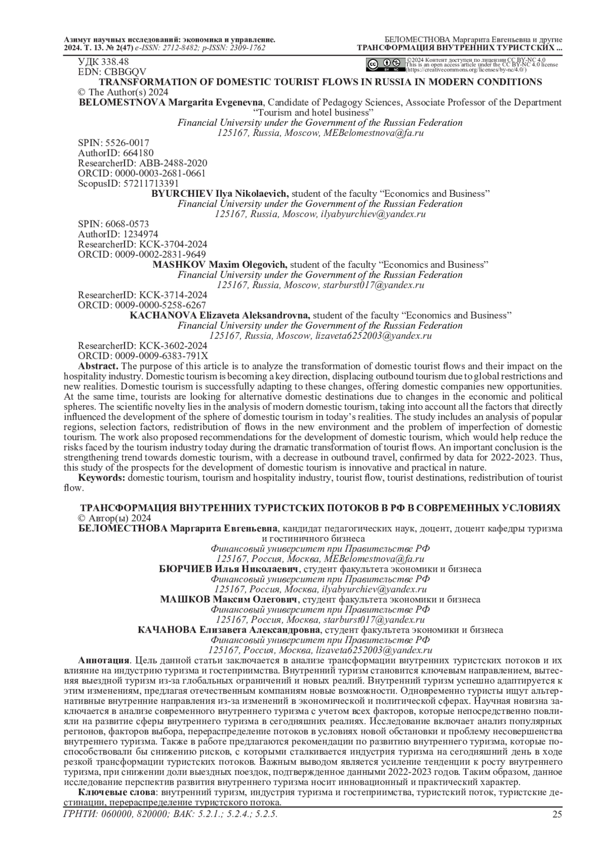 2. Bogomazova I.V., Klimova T.B. Digital services and the tourist ecosystem in the development of domestic tourism // Economics.Computer science. - 2022. - T. 49, No. 4. - P. 718-730. EDN: XFWWVF