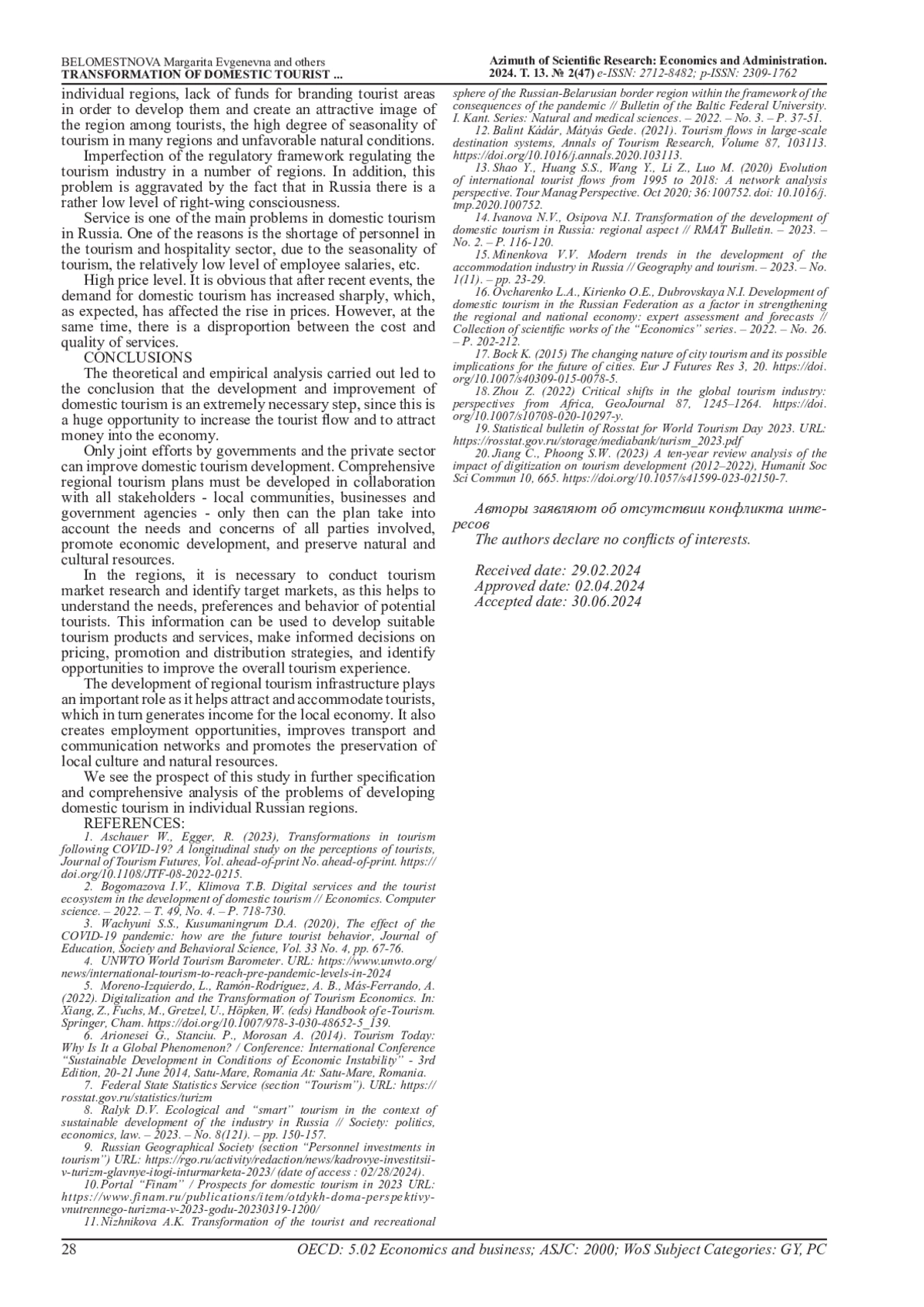 14. Ivanova N.V., Osipova N.I. Transformation of the development of domestic tourism in Russia: regional aspect // RMAT Bulletin. - 2023. - No. 2. - P. 116-120.
