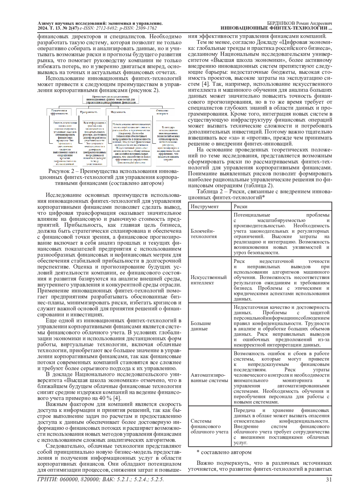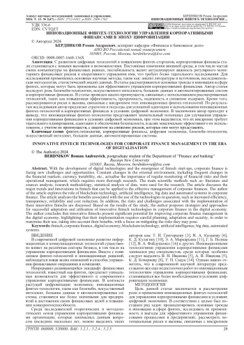С развитием цифровых технологий и появлением финтех-стартапов, корпоративные финансы стали сталкиваться с новыми вызовами и возможностями. Постоянные изменения внешней среды, в том числе частая смена конъюнктуры на финансовых рынках, нестабильность валют актуализируют важность регулярного мониторинга финансовых рисков и оперативного управления ими, что требует более тщательного исследования. Для исследования применялись основные научные методы, такие как: анализ литературы и источников, исследовательская методология, статистический анализ данных. В статье рассматриваются основные тренды и инновации в сфере финтех, которые могут быть применены для эффективного управления корпоративными финансами. Автор статьи исследует роль блокчейн-технологии, искусственного интеллекта, больших данных и автоматизированных систем в корпоративных финансах. В статье проведен анализ преимуществ, связанных с использованием рассматриваемых технологий, таких как повышенная эффективность, прозрачность, надежность и снижение издержек. Кроме того, рассматриваются риски и вызовы, связанные с внедрением этих инновационных финтех-технологий. По результатам исследования автор предлагает стратегии и подходы для успешной адаптации и использования инновационных финтех-технологий в корпоративных финансах в условиях цифровой экономики. В заключении автор приходит к выводу, что инновационные финтех-технологии представляют значительный потенциал для улучшения управления корпоративными финансами в условиях цифровой экономики, при этом выделяется, что их внедрение требует тщательного планирования, адаптации и обеспечения безопасности, в целях максимально эффективного их использования, с учетом их преимуществ, с акцентом на снижение рисков, которые они могут представлять.