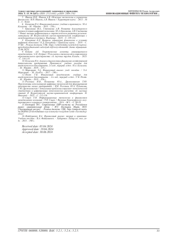 14. Сацук Т.П. Информационные технологии в финансовом менеджменте компаний / Т.П. Сацук // Вестник Красноярского государственного аграрного университета. - 2014. - № 1. - С. 30-33. EDN: RXKRRF