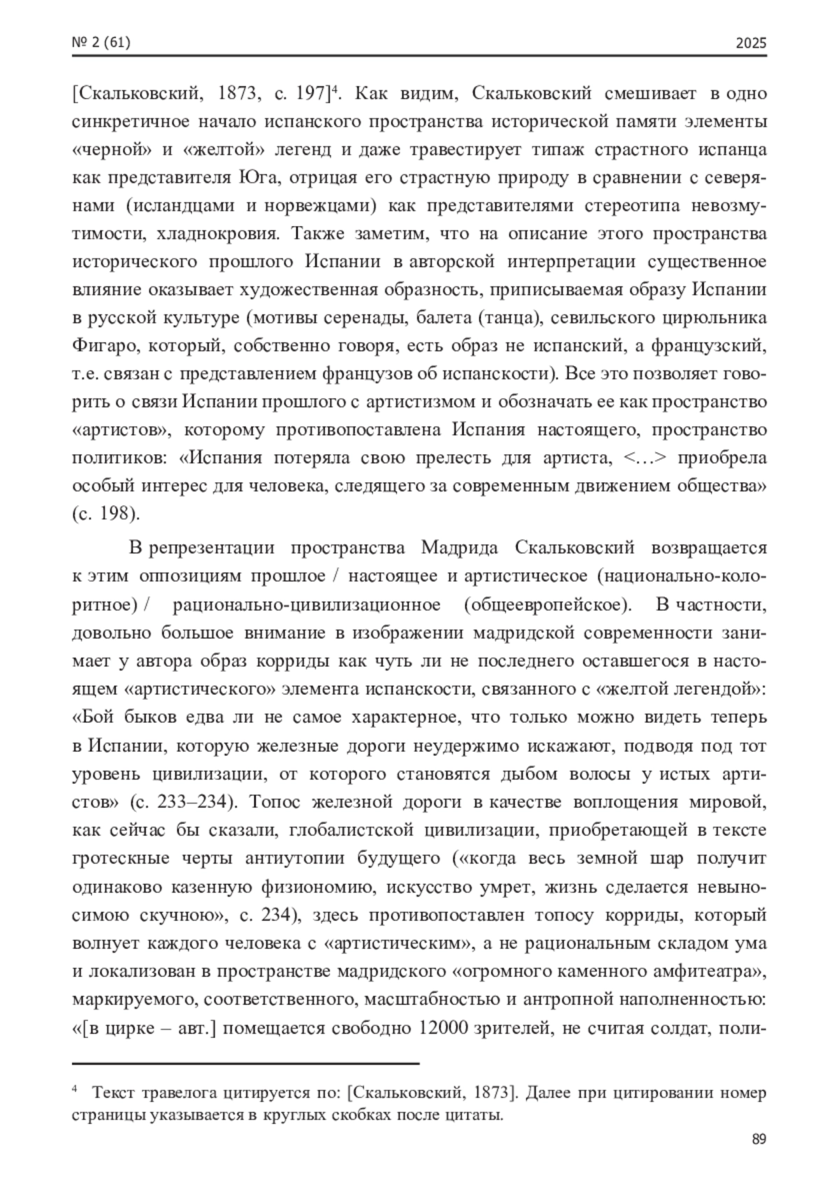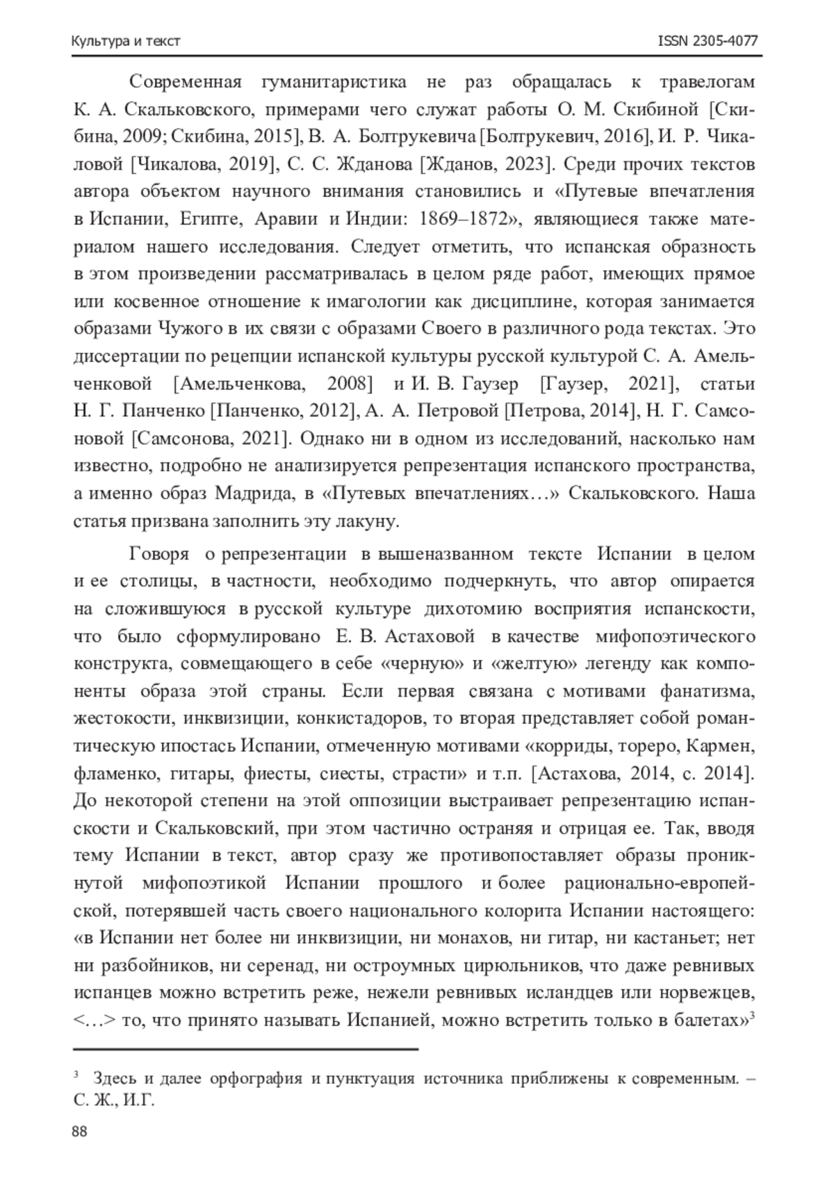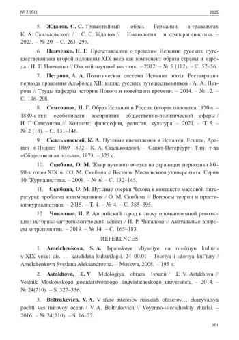 Современная гуманитаристика не раз обращалась к травелогам К. А. Скальковского, примерами чего служат работы О. М. Скибиной [Ски- бина, 2009; Скибина, 2015], В. А. Болтрукевича [Болтрукевич, 2016], И. Р. Чикаловой [Чикалова, 2019], С. С. Жданова [Жданов, 2023]. Среди прочих текстов автора объектом научного внимания становились и «Путевые впечатления в Испании, Египте, Аравии и Индии: 1869–1872», являющиеся также материалом нашего исследования.