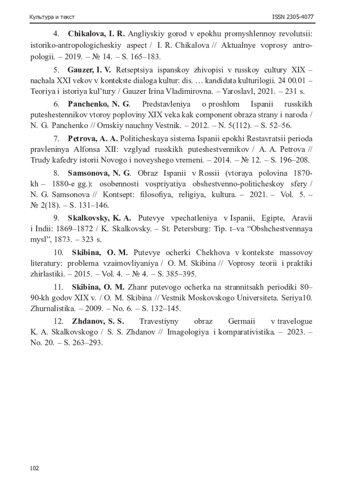 6. Панченко, Н. Г. Представления о прошлом Испании русских путешественников второй половины XIX века как компонент образа страны и народа / Н. Г. Панченко // Омский научный вестник. - 2012. - № 5 (112). - С. 52-56.