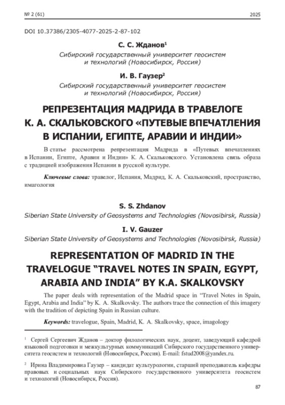 В статье рассмотрена репрезентация Мадрида в «Путевых впечатлениях в Испании, Египте, Аравии и Индии» К. А. Скальковского. Установлена связь образа с традицией изображения Испании в русской культуре.