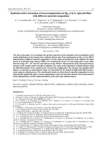 A. V. Voitsekhovskii, D. V. Grigoryev, A. P. Kokhanenko, A. G. Korotaev, I. I. Iznin, S. A. Dvoretskii, and N. N. Mikhailov Radiation defect formation at boron implantation in Hg1-xCdxTe epitaxial films with different material composition 27