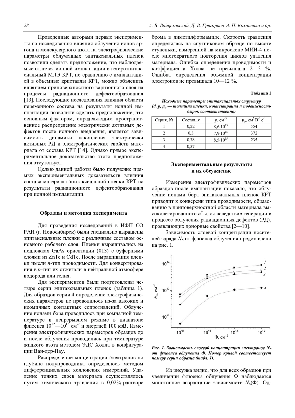 Войцеховский А. В., Григорьев Д. В., Коханенко А. П., Коротаев А. Г., Ижнин И. И., Дворецкий С. А., Михайлов Н. Н. Радиационное дефектообразование при ионной имплантации бора в эпитаксиальные пленки Hg1-xCdxTe различного состава 27