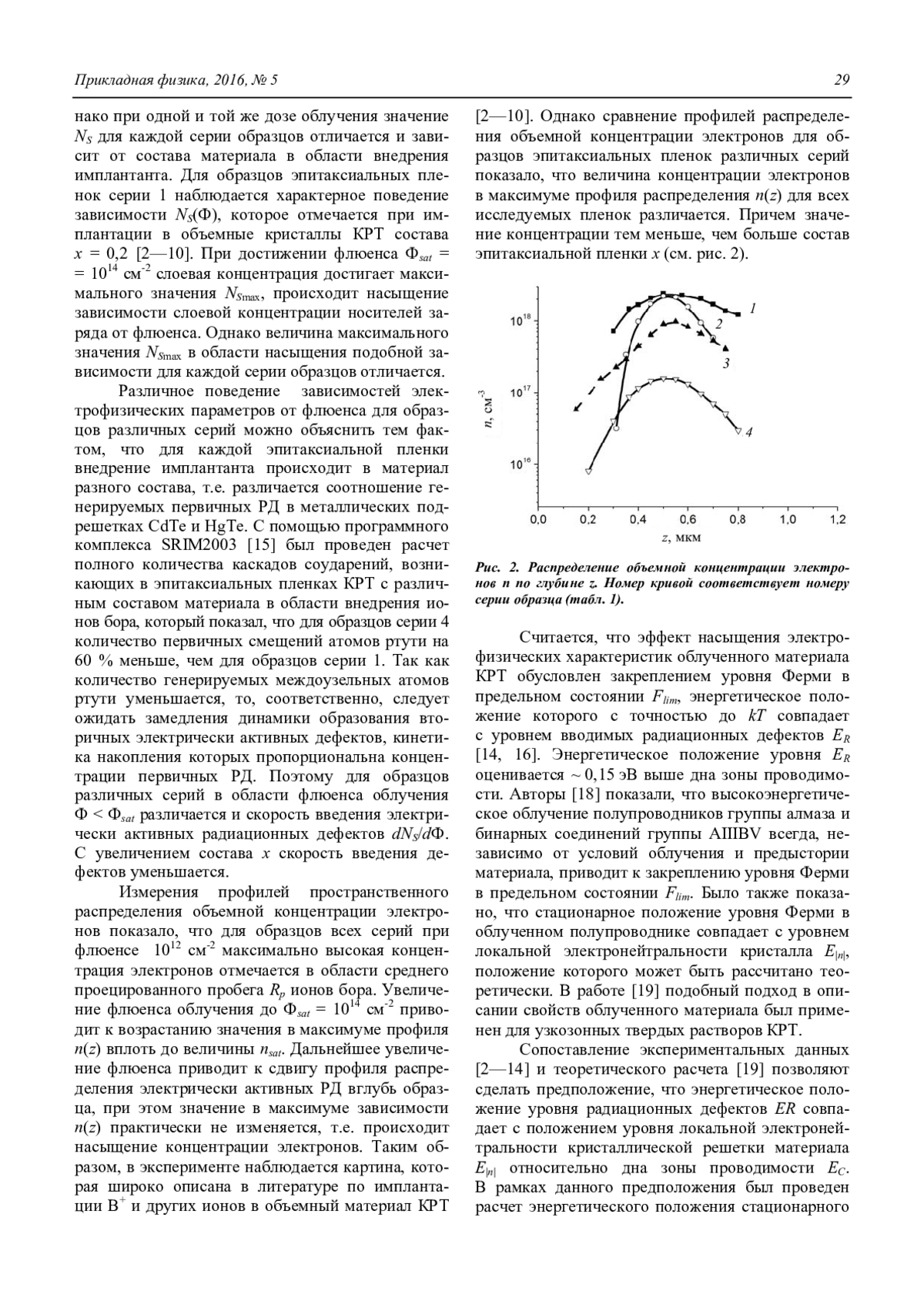 В работе проведено исследование специфики формирования и эволюции электрически активных радиационных дефектов при имплантации ионов бора в эпитаксиальные пленки Hg1-xCdxTe с различным составом в области внедрения имплантанта. Эпитаксиальные пленки, выращенные методом молекулярно-лучевой эпитаксии, облучались ионами бора с энергией 100 кэВ в диапазоне флюенса 1012—1015 см-2. Измерение электрофизических параметров образцов до и после облучения производилось методом ЭДС Холла в конфигурации Ван-дер-Пау. Распределение объемной концентрации электронов по глубине облученного материала определялось методом дифференциальных холловских измерений. Полученные экспериментальные данные однозначно показывают, что результаты ионной имплантации определяются зависимостью динамики накопления электрически активных радиационных дефектов и электрофизических свойств материала от состава КРТ.