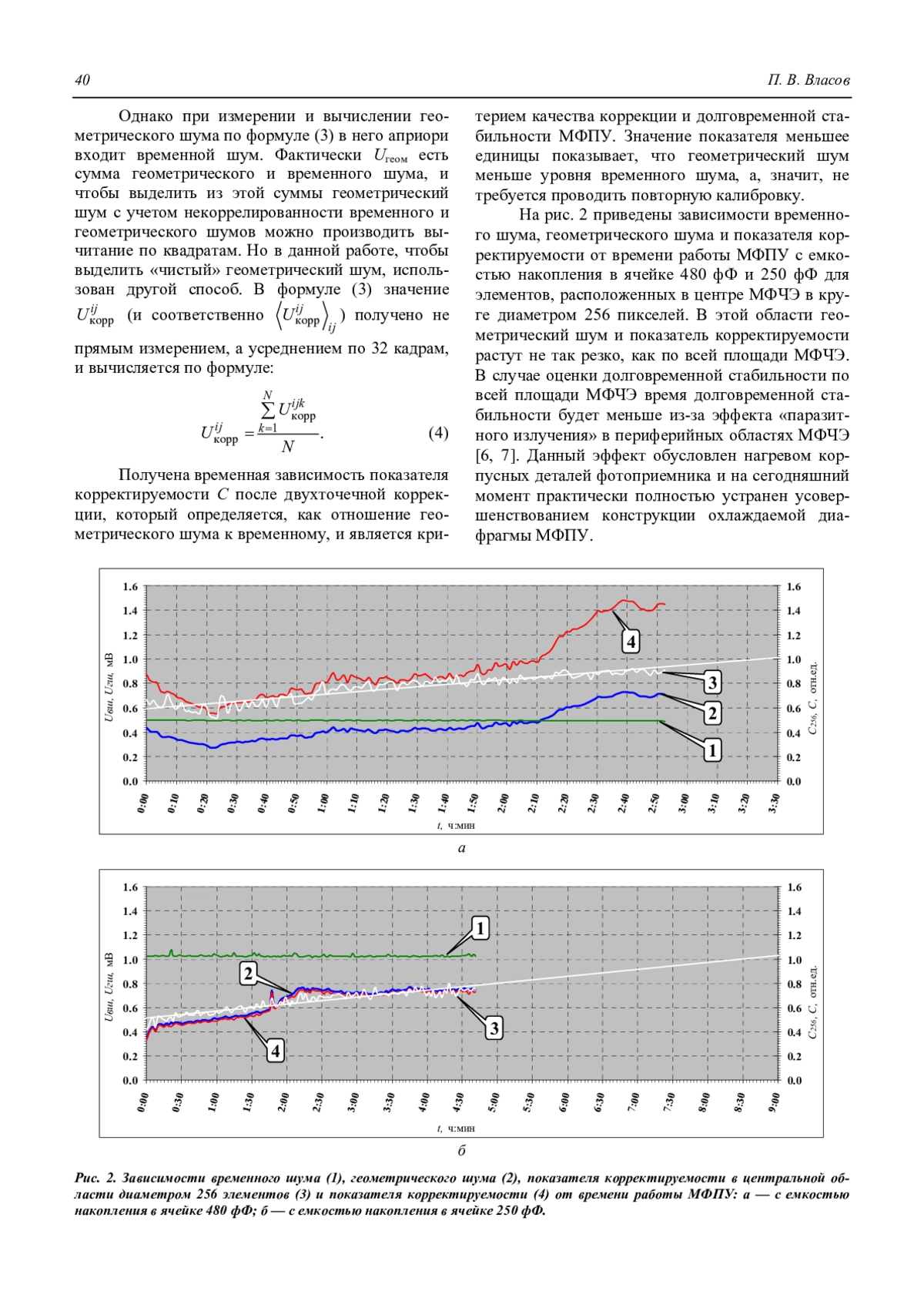 Рост геометрического шума в периферийных областях МФЧЭ в бóльшей степени обусловлен эффектом «паразитного излучения». Общий рост геометрического шума не связан с фоточувствительными элементами, а обусловлен аналогоцифровыми схемами, расположенными после ячеек БИС считывания. Предположительно, его причиной является нагрев электроники предварительного усиления, температура которой за время работы увеличивается на 1020 °С.