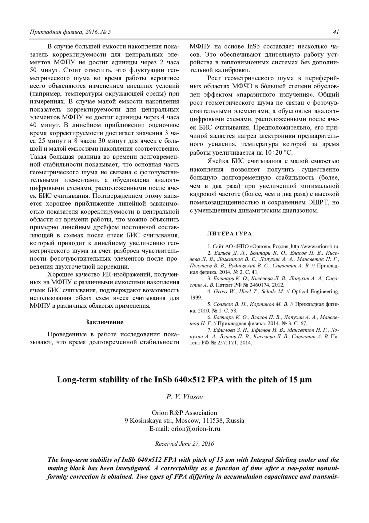 Власов П. В. Долговременная стабильность матричных фотоприемных устройств на основе антимонида индия формата 640512 элементов с шагом 15 мкм 38