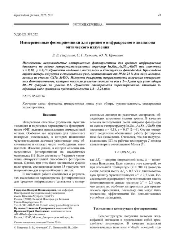 Гаврушко В. В., Кузюков С. Г., Прошкин Ю. Н. Иммерсионные фотоприемники для среднего инфракрасного диапазона оптического излучения 43