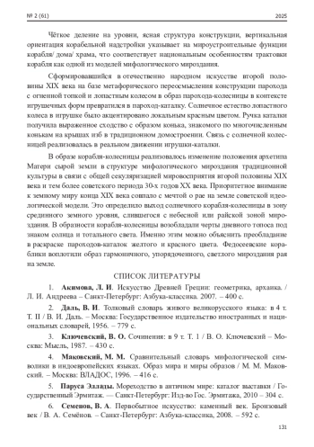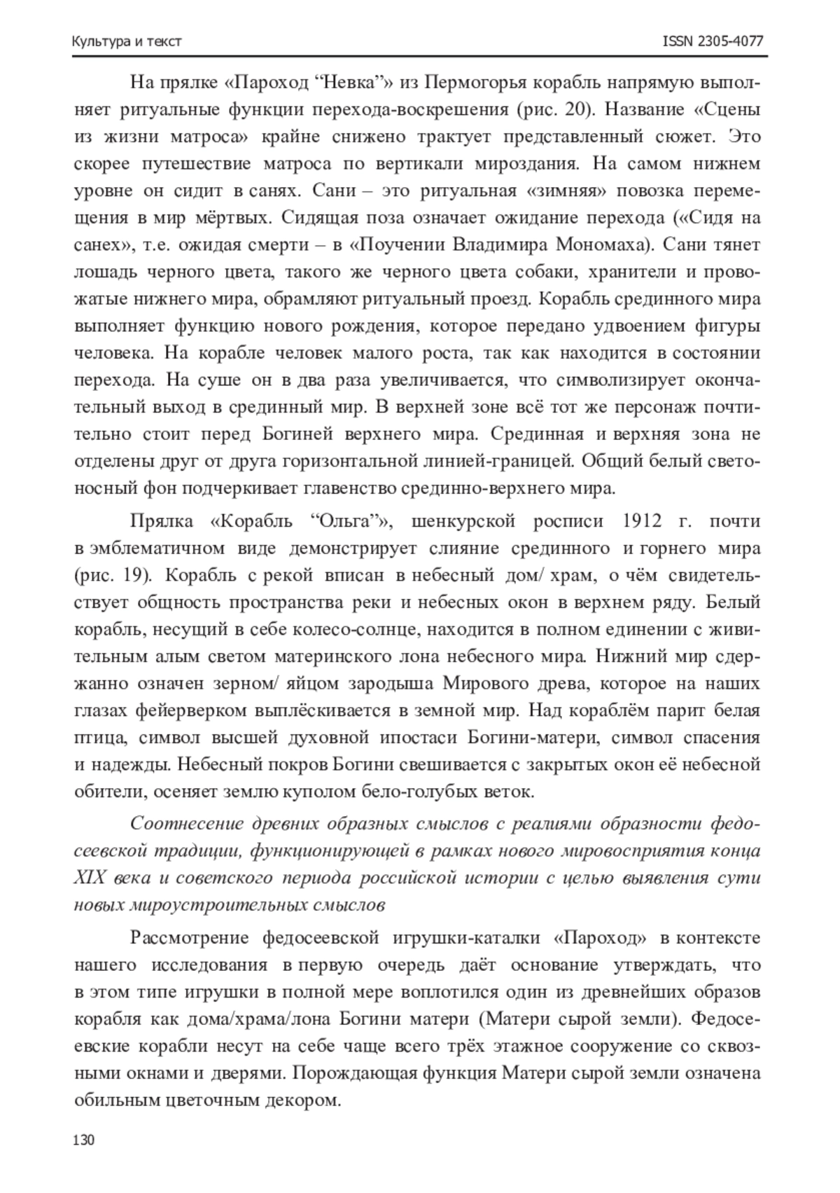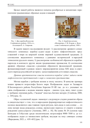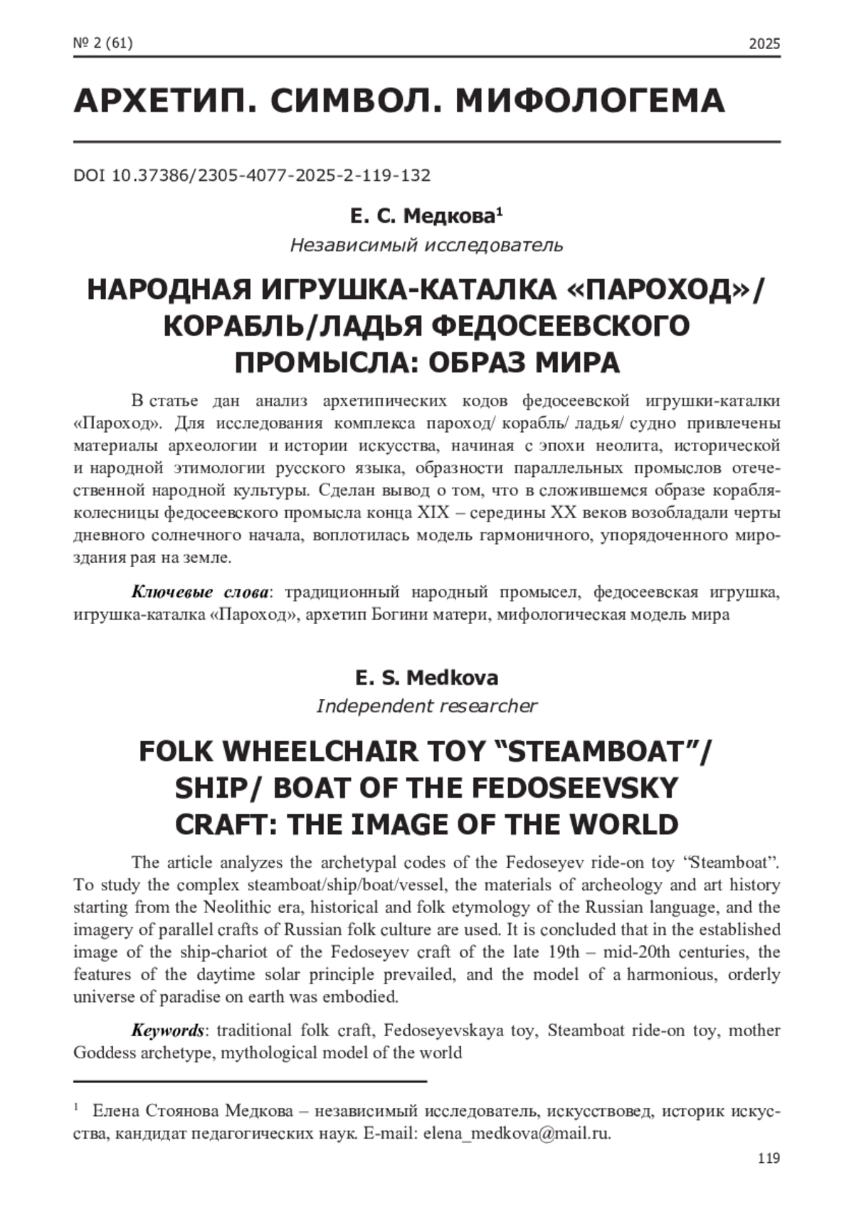 В статье дан анализ архетипических кодов федосеевской игрушки-каталки «Пароход». Для исследования комплекса пароход/ корабль/ ладья/ судно привлечены материалы археологии и истории искусства, начиная с эпохи неолита, исторической и народной этимологии русского языка, образности параллельных промыслов отечественной народной культуры. Сделан вывод о том, что в сложившемся образе корабля-колесницы федосеевского промысла конца XIX - середины ХХ веков возобладали черты дневного солнечного начала, воплотилась модель гармоничного, упорядоченного мироздания рая на земле.