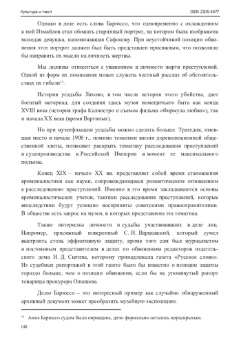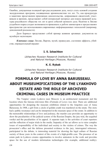 Подмосковная усадьба Варгиных «Ляхово» - памятник архитектуры и место съемок известного телефильма «Формула любви». В таком качестве усадьба служит объектом интереса туристов. Привязка к событиям фильма позволяет развернуть в усадьбе экспозиции, посвященные дворянскому быту времен царствования Екатерины II и вопросам кинопроизводства. Также существуют дополнительные возможности для проектирования музейной экспозиции связанные с забытым в настоящее время делом Анны Барюссо. В 1908 г. в усадьбе произошло убийство девушки из кружка золотой молодежи. История имела общественный резонанс за счет причастности представителей элиты общества начала XX века и может быть интерпретирована в музейном пространстве усадьбы. Помимо запоминающихся отношений любви и ревности, дело об убийстве дает возможность показать особенности судебной системы Российской Империи, суда присяжных, оправдательного вердикта и особенностей его обжалования. Отдельная тема - деятельность судебных репортеров и отражение в средствах массовой информации крупных судебных процессов. Ненаказанность деяния позволяет поднимать сложные вопросы ответственности личности и общества перед жертвами преступлений. Ошибки, допущенные полицией при расследовании дела, могут стать основой создания экскурсионных программ, посвященных криминалистике тех лет. То, как прокуратура и защитник представляли присяжным доказательства, допрашивали свидетелей, участвовали в прениях, представляет собой интересный материал для показа правовой культуры российского общества тех лет в срезе событий громкого дела. Наличие в Ляхово усадебного парка создает возможности привлекать к работе аниматоров и предоставляет пространство для использования современных информационных технологий (например, дополненной реальности). Дело Барюссо представляет собой пример влияния архивных документов на музейную экспозицию.