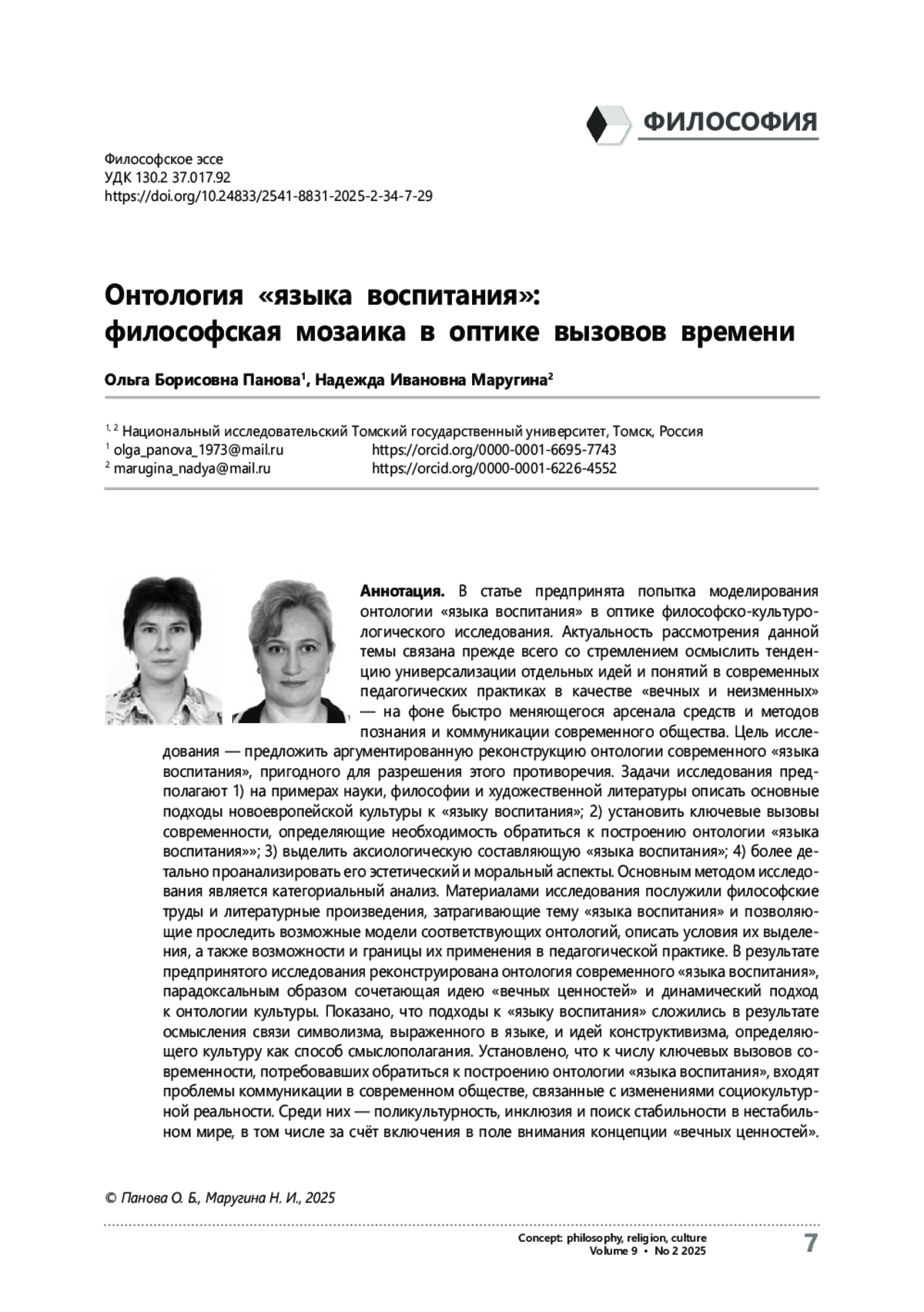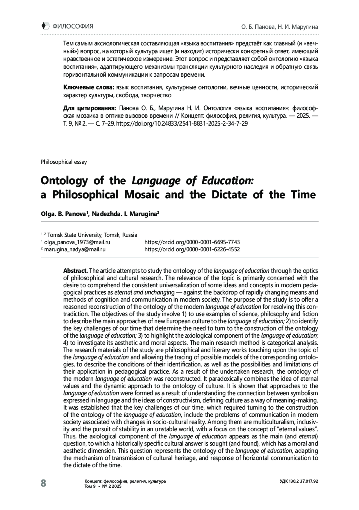 В статье предпринята попытка моделирования онтологии «языка воспитания» в оптике философско-культурологического исследования. Актуальность рассмотрения данной темы связана прежде всего со стремлением осмыслить тенденцию универсализации отдельных идей и понятий в современных педагогических практиках в качестве «вечных и неизменных» — на фоне быстро меняющегося арсенала средств и методов познания и коммуникации современного общества. Цель исследования — предложить аргументированную реконструкцию онтологии современного «языка воспитания», пригодного для разрешения этого противоречия. Задачи исследования предполагают 1) на примерах науки, философии и художественной литературы описать основные подходы новоевропейской культуры к «языку воспитания»; 2) установить ключевые вызовы современности, определяющие необходимость обратиться к построению онтологии «языка воспитания»»; 3) выделить аксиологическую составляющую «языка воспитания»; 4) более детально проанализировать его эстетический и моральный аспекты. Основным методом исследования является категориальный анализ. Материалами исследования послужили философские труды и литературные произведения, затрагивающие тему «языка воспитания» и позволяющие проследить возможные модели соответствующих онтологий, описать условия их выделения, а также возможности и границы их применения в педагогической практике. В результате предпринятого исследования реконструирована онтология современного «языка воспитания», парадоксальным образом сочетающая идею «вечных ценностей» и динамический подход к онтологии культуры. Показано, что подходы к «языку воспитания» сложились в результате осмысления связи символизма, выраженного в языке, и идей конструктивизма, определяющего культуру как способ смыслополагания. Установлено, что к числу ключевых вызовов современности, потребовавших обратиться к построению онтологии «языка воспитания», входят проблемы коммуникации в современном обществе, связанные с изменениями социокультурной реальности. Среди них — поликультурность, инклюзия и поиск стабильности в нестабильном мире, в том числе за счёт включения в поле внимания концепции «вечных ценностей». Тем самым аксиологическая составляющая «языка воспитания» предстаёт как главный (и «вечный») вопрос, на который культура ищет (и находит) исторически конкретный ответ, имеющий нравственное и эстетическое измерение. Этот вопрос и представляет собой онтологию «языка воспитания», адаптирующего механизмы трансляции культурного наследия и обратную связь горизонтальной коммуникации к запросам времени.