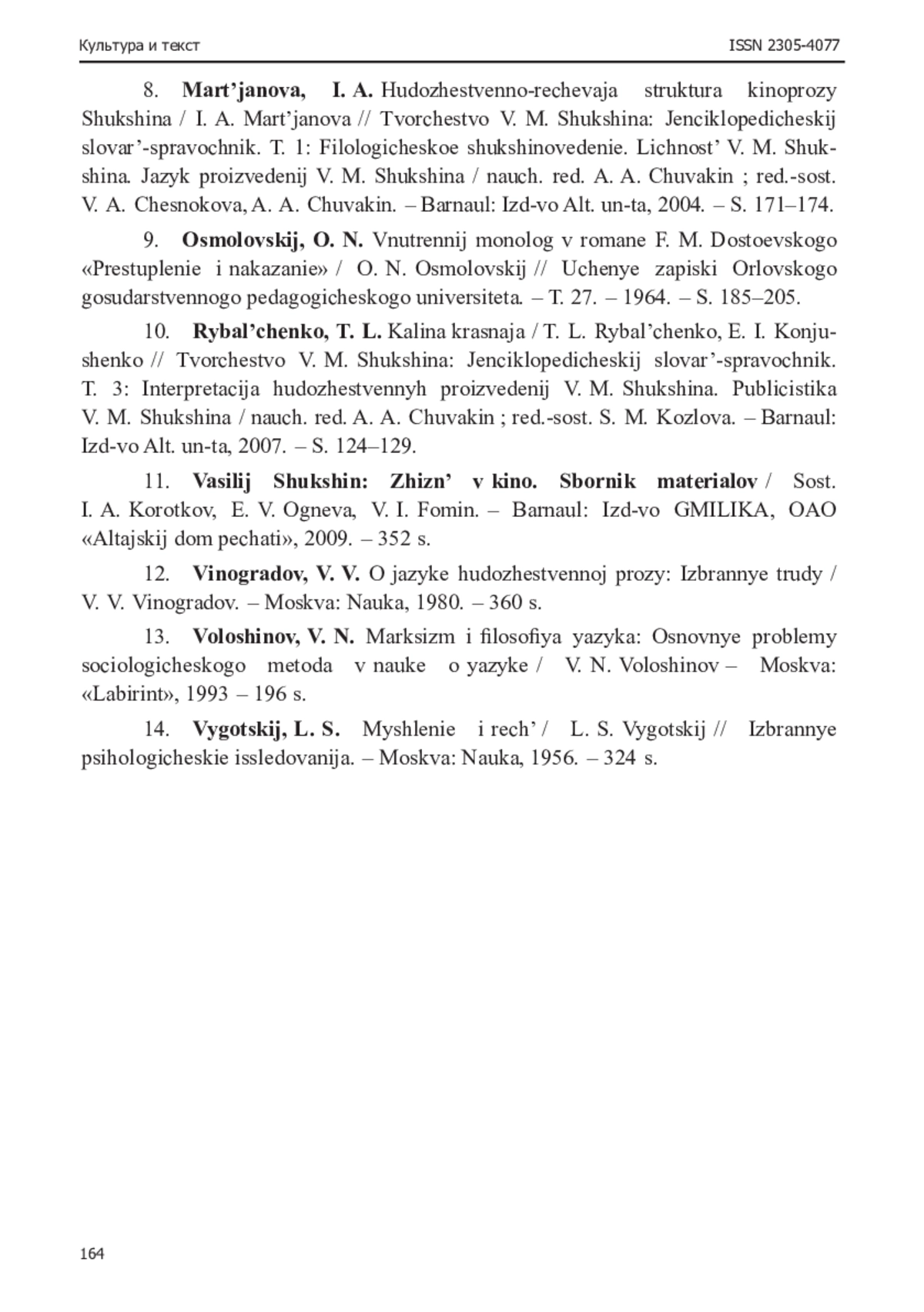 11. Мартьянова, И. А. Художественно-речевая структура кинопрозы Шукшина / И. А. Мартьянова // Творчество В. М. Шукшина: Энциклопедический словарь-справочник. Т. 1: Филологическое шукшиноведение. Личность В. М. Шукшина. Язык произведений В. М. Шукшина / науч. ред. А. А. Чувакин; ред.-сост. В. А. Чеснокова, А. А. Чувакин. - Барнаул: Изд-во Алт. ун-та, 2004. - С. 171-174. EDN: UPOWQV