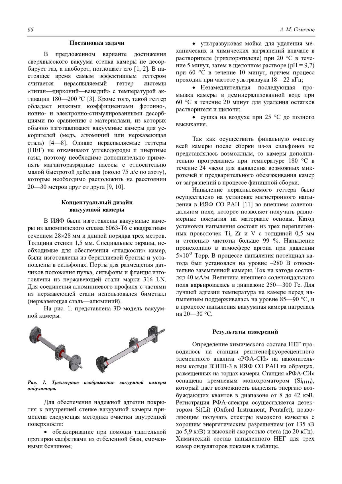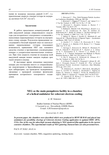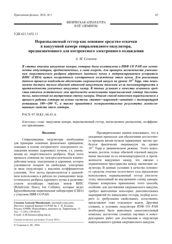 Семенов A. М. Нераспыляемый геттер как основное средство откачки в вакуумной камере спиралевидного ондулятора, предназначенного для когерентного электронного охлаждения 65
