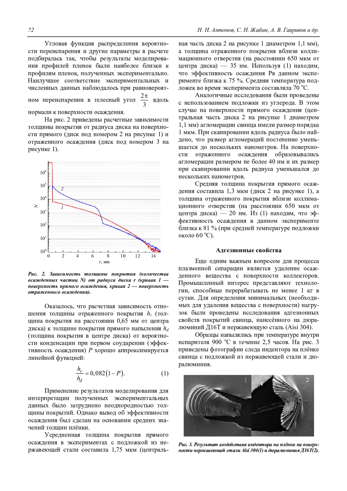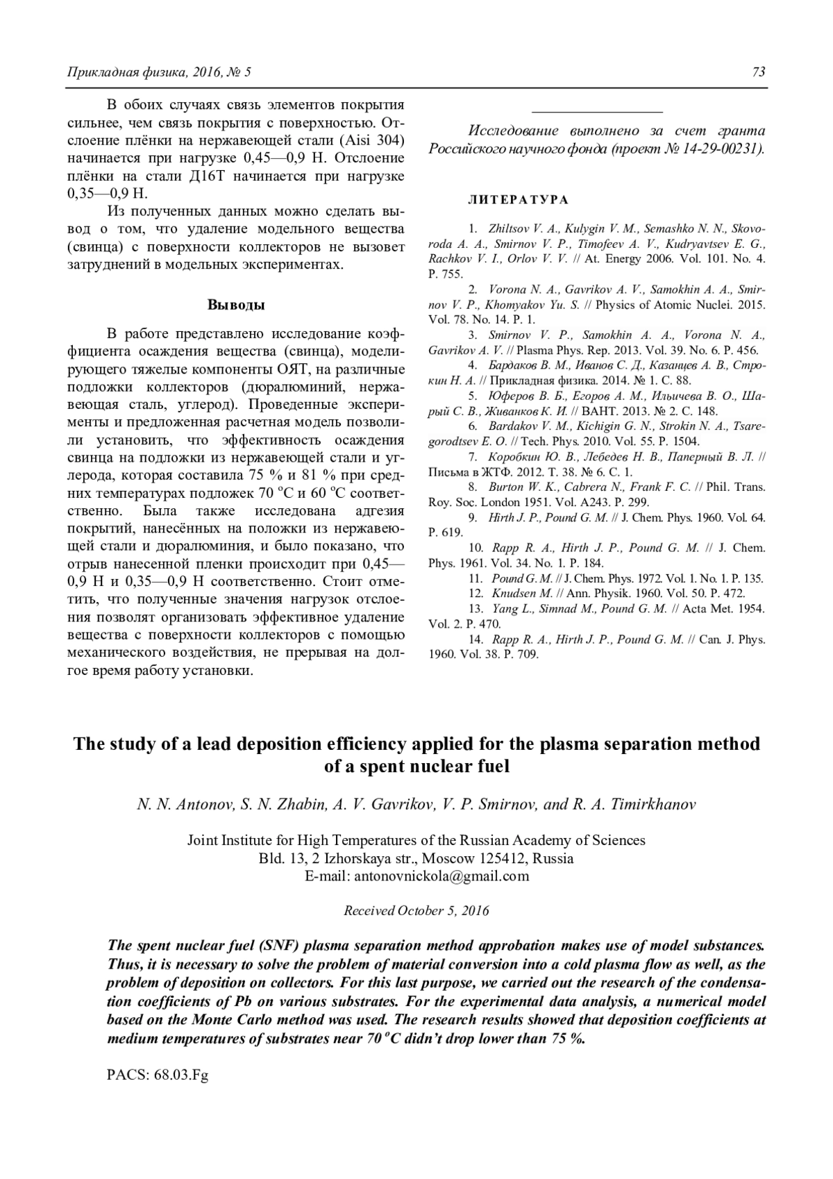 Антонов Н. Н., Жабин С. Н., Гавриков А. В., Смирнов В. П., Тимирханов Р. А. Исследование эффективности осаждения свинца для задач плазменной сепарации отработавшего ядерного топлива 70