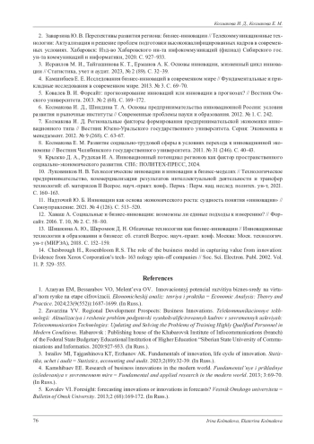 2. Заварзина Ю. В. Перспективы развития региона: бизнес-инновации // Телекоммуникационные технологии: Актуализация и решение проблем подготовки высококвалифицированных кадров в современных условиях. Хабаровск: Изд-во Хабаровского ин-та инфокоммуникаций (филиал) Сибирского гос. ун-та коммуникаций и информатики, 2020. С. 927-933. EDN: EJTKXQ