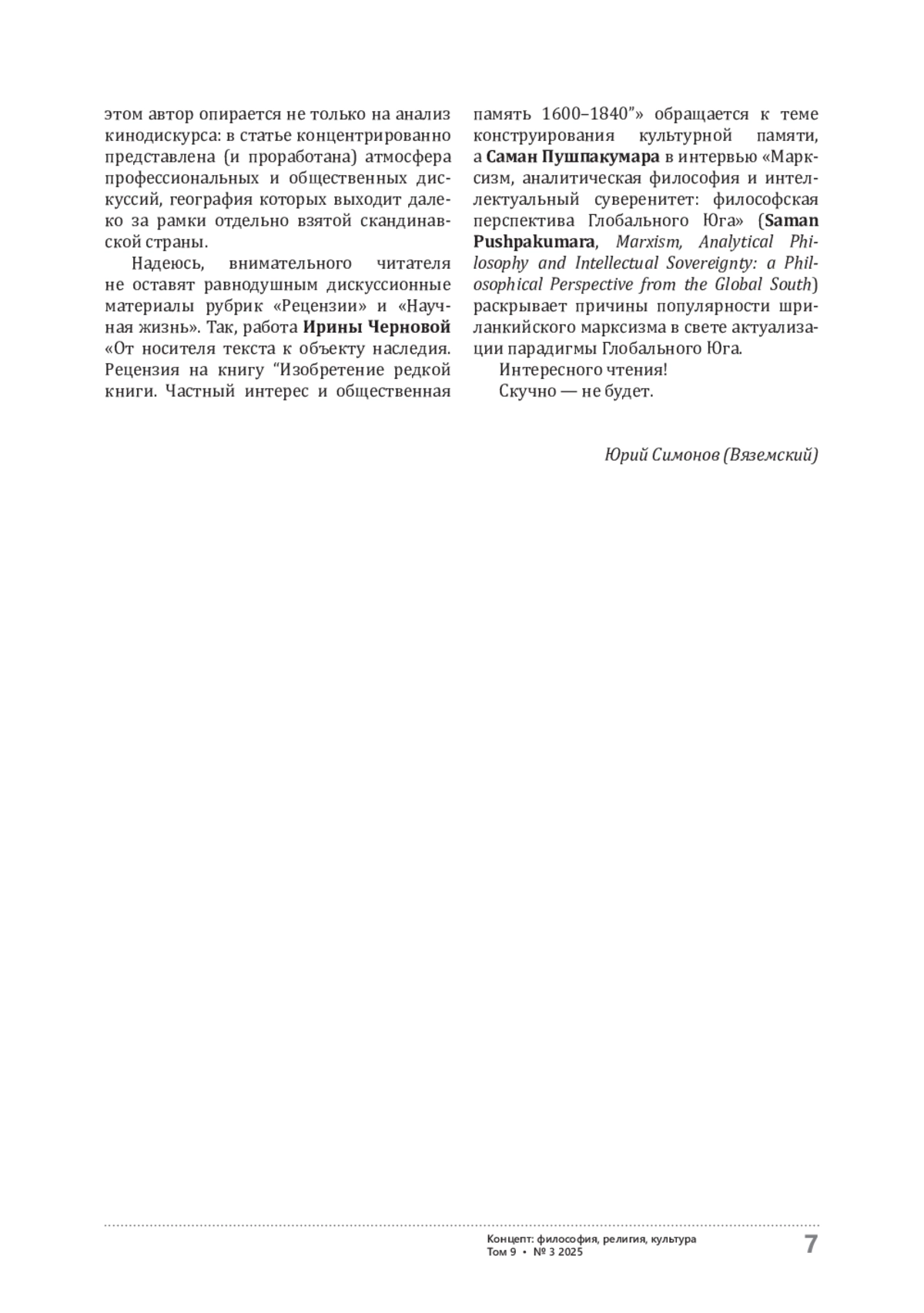 В интервью с доктором наук Саманом Пушпакумара из университета Шри-Ланки обсуждается актуальность и значимость марксистской философии в глобальном и национальном контекстах. Обсуждение выстраивается вокруг трёх ключевых тем. Во-первых, доктор Саман Пушпакумара высвечивает историческую траекторию адаптации марксистских идей на Шри-Ланке, прослеживая путь от антиколониальной борьбы до современной политической жизни государства. Значительное политическое влияние марксизма подтверждается недавним электоральным успехом партии марксистской ориентации, который наглядно иллюстрирует синтез универсалистских нарративов марксизма и их национальных интерпретаций. С. Пушпакумара продолжает мысль о трансформации универсального, отстаивая идею «условных абсолютов», балансирующих между универсальными принципами и их конкретной (и потому всегда контекстуальной) интерпретацией. В этой логике он рассматривает идею классовой справедливости, которая существует сегодня не только как моральная категория, но и инструмент продвижения групповых интересов и даже форма морального предпринимательства. Говоря о системе высшего образования, С. Пушпакумара объясняет доминирующее положение западной аналитической философии в высшей школе колониальным прошлым стран Южной Азии. Он отмечает, что доминирование аналитической философии грозит маргинализировать альтернативные философские традиции. Эта универсалистская парадигма глобализованной науки противопоставляется суверенной науке, отстаивающей автономию региональной интеллектуальной мысли. В качестве примера эффективного сопротивления западному доминированию называется Россия. Интервью завершается аргументом в пользу развития и укрепления диалога между Россией и странами Глобального Юга. Такой диалог представляется альтернативным проектом «евразийской философии», способствующим децентрализации процесса производства знаний, в котором найдется место для более широкого обсуждения экзистенциальных, этических и культурных вопросов.