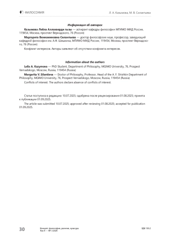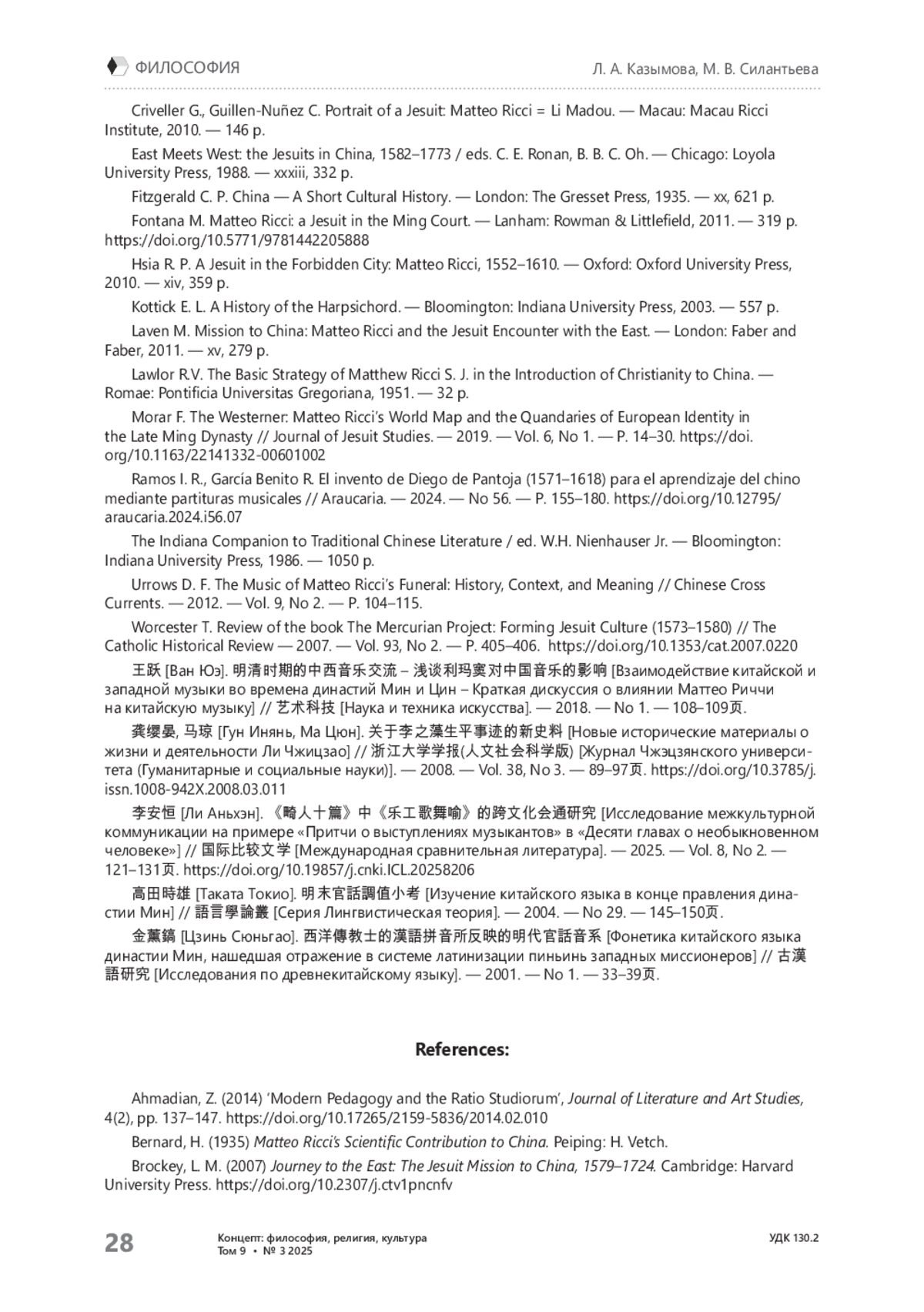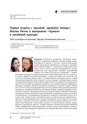 Актуальность исследования обусловлена необходимостью исторической рефлексии успешных моделей межцивилизационного диалога, в частности, стратегии аккомодации, которая демонстрирует эффективность культурного взаимодействия. В центре внимания — музыкальная составляющая миссии Маттео Риччи в Китае, остающаяся периферийной в изучении особенностей стиля музыкального мышления представителей культуры этой страны. Цель данного исследования — выявить философско-культурные основания музыкальной составляющей миссии Риччи и описать их в контексте приёмов культурной аккомодации, которые использовал этот миссионер. Для этого было необходимо решить задачи: 1) систематизировать имеющиеся данные о первом «музыкальном знакомстве» Китая с Европой и уточнить подходы к проблеме первого появления европейской музыки в Китае; 2) выявить предпосылки использования Риччи музыкальной деятельности в качестве миссионерского приёма; 3) уточнить фактологическую информацию, касающуюся датировок, названий музыкальных инструментов, сочинений и других аспектов миссии Риччи в контексте исследуемой темы; 4) описать коммуникативно значимые результаты музыкального «взаимодействия» Риччи с императором Ваньли, китайскими учёными и чиновниками; 5) установить, каким образом иезуиты использовали элементы европейской музыкальной теории в обучении китайскому языку. Материалами исследования послужили источники, комментаторская и исследовательская литература на китайском и европейских языках, касающиеся темы «первой встречи» европейской музыки и китайской культуры. Методология основана на синтезе герменевтического анализа сопоставляемых текстов (труды Риччи, письма, латинские и китайские источники) и принципов историко-культурной антропологии, что позволяет реконструировать символические значения и коммуникативные интенции, вкладывавшиеся в музыкальные практики. В работе применён комплексный междисциплинарный подход, объединяющий призмы философии культуры, истории, музыковедения, семиотики и лингвистики. Для проведения герменевтического анализа имеющихся тексов использованы биографический и историко-генетический методы, а также приёмы сопоставления соответствующих европейских и китайских названий инструментов. В результате установлено, что музыка выступала ключевым компонентом миссионерской стратегии Риччи в силу её мировоззренческой роли в китайской культуре, сравнительной доступности и допустимости использования «музыкальной» формы проповеди среди китайской элиты, богатыми возможностями аккомодации музыкального материала к её мировоззренческим и нравственным установкам. Выводы: 1) миссия Риччи сумела преодолеть первоначальное непонимание и отрицание с помощью удачной стратегии первоначальной аккомодации, избранной Риччи, где музыка играла неслучайную роль; 2) использование музыки в качестве специфического «кода» евангелизации было определено принадлежностью Риччи к Ордену иезуитов и его образованием, включавшем музыку как один из существенных компонентов; 3) в ходе сопоставления широкого спектра имеющихся данных с большой степенью вероятности первым «западным» инструментом, привезённым в Китай Маттео Риччи, был клавесин, а не клавикорд; при этом разночтения в имеющихся данных о появлении первого европейс