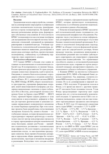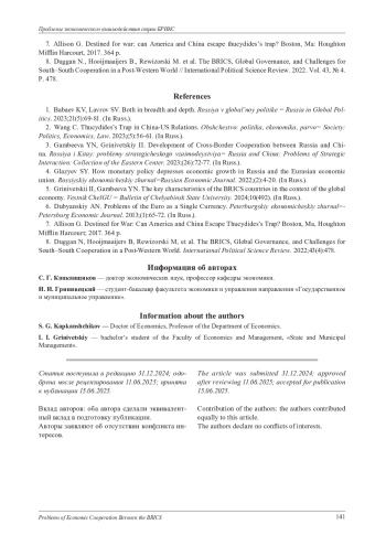 5. Гринивецкий И. И., Гамбеева Ю. Н. Ключевые характеристики стран БРИКС на фоне мировой экономики // Вестник ЧелГУ. 2024. № 10 (492). С. 186-193.