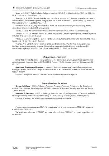 10. Дианина С. Ю., Халиль М.А., Глаголев В.С. «Культурный ислам» в пространстве Северной Европы // Балтийский регион. - 2019. - Т. 11, № 3. - С. 142-160.