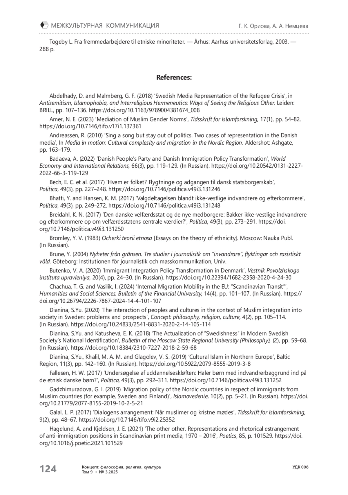 9. Дианина С. Ю., Катушева Е. К. Актуализация понятия «шведскость» в вопросе национальной идентичности современного общества Швеции // Вестник Московского государственного областного университета. Серия: Философские науки. - 2018. - №2. - С. 59-68. https://doi.org/10.18384/23107227-2018-2-59-68