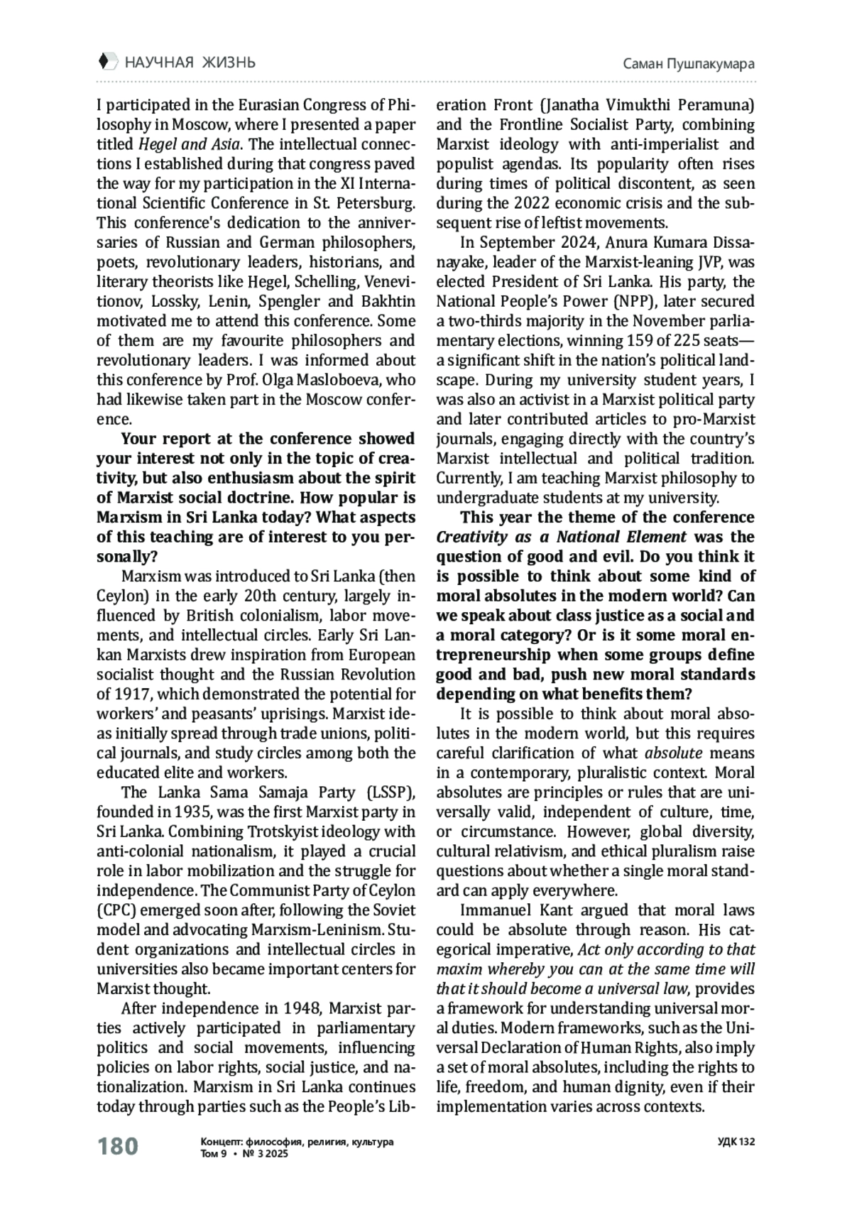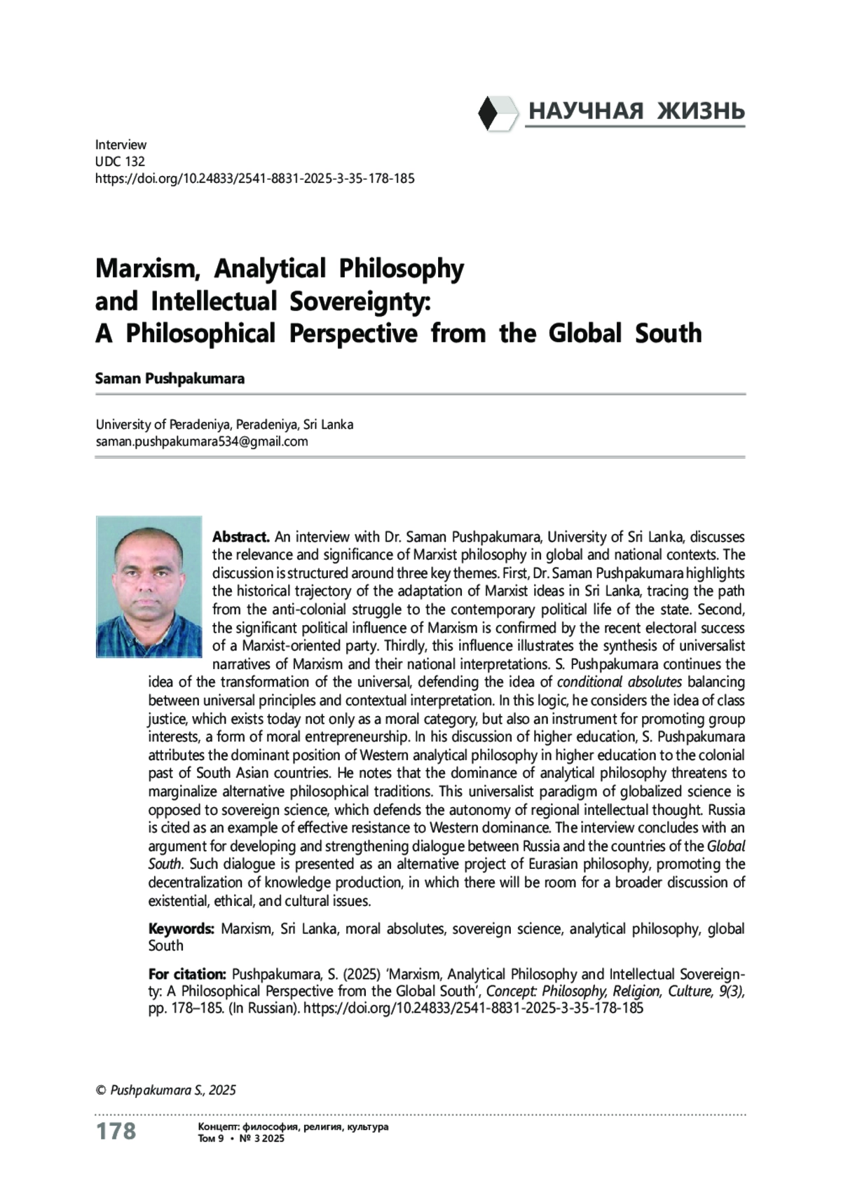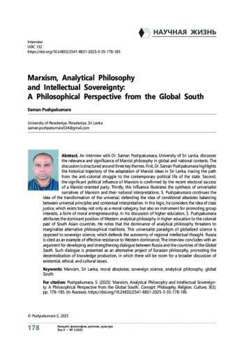 В интервью с доктором наук Саманом Пушпакумара из университета Шри-Ланки обсуждается актуальность и значимость марксистской философии в глобальном и национальном контекстах. Обсуждение выстраивается вокруг трёх ключевых тем. Во-первых, доктор Саман Пушпакумара высвечивает историческую траекторию адаптации марксистских идей на Шри-Ланке, прослеживая путь от антиколониальной борьбы до современной политической жизни государства. Значительное политическое влияние марксизма подтверждается недавним электоральным успехом партии марксистской ориентации, который наглядно иллюстрирует синтез универсалистских нарративов марксизма и их национальных интерпретаций. С. Пушпакумара продолжает мысль о трансформации универсального, отстаивая идею «условных абсолютов», балансирующих между универсальными принципами и их конкретной (и потому всегда контекстуальной) интерпретацией. В этой логике он рассматривает идею классовой справедливости, которая существует сегодня не только как моральная категория, но и инструмент продвижения групповых интересов и даже форма морального предпринимательства. Говоря о системе высшего образования, С. Пушпакумара объясняет доминирующее положение западной аналитической философии в высшей школе колониальным прошлым стран Южной Азии. Он отмечает, что доминирование аналитической философии грозит маргинализировать альтернативные философские традиции. Эта универсалистская парадигма глобализованной науки противопоставляется суверенной науке, отстаивающей автономию региональной интеллектуальной мысли. В качестве примера эффективного сопротивления западному доминированию называется Россия. Интервью завершается аргументом в пользу развития и укрепления диалога между Россией и странами Глобального Юга. Такой диалог представляется альтернативным проектом «евразийской философии», способствующим децентрализации процесса производства знаний, в котором найдется место для более широкого обсуждения экзистенциальных, этических и культурных вопросов.