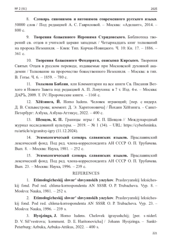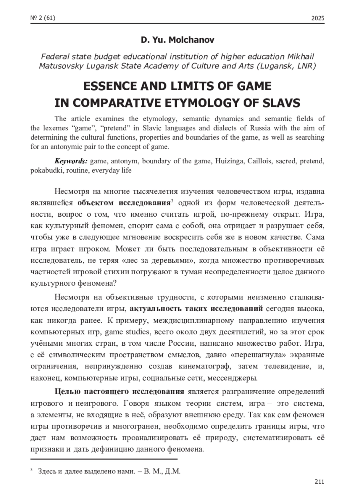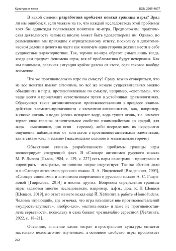 В статье исследуется этимология, смысловая динамика и семантические поля лексем «игра», «понарошку» в славянских языках и говорах России с целью определения культурных функций, свойств и границ игры, а также поиска антонимической пары понятию игры.