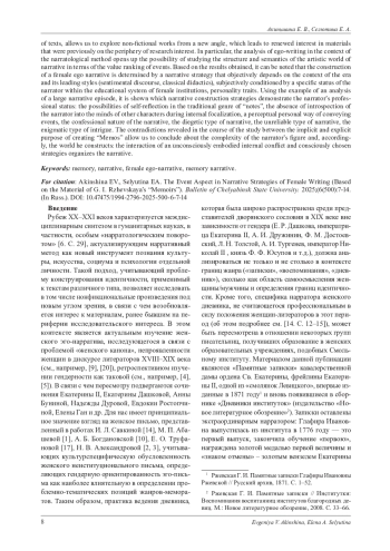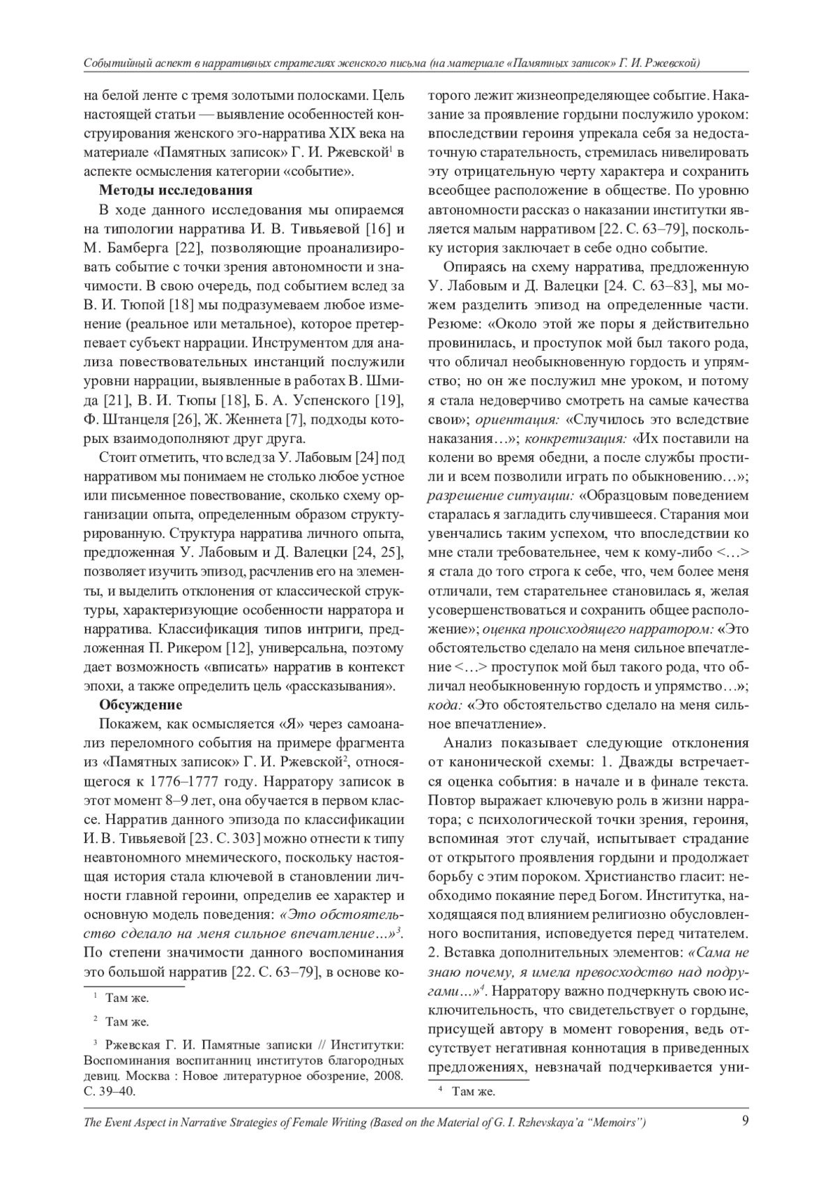 В статье исследуется событийный аспект в нарративных стратегиях женского эго-письма на материале «Памятных записок» Г. И. Ржевской. Актуальность данной темы обусловлена тем, что наррато-логический метод учитывает проблему конструирования идентичности, применимый к нарративам различного типа, позволяет исследовать в том числе нехудожественные произведения под новым углом зрения, в связи с чем возобновляется интерес к текстам, ранее бывшим на периферии филологического интереса. Анализ эго-письма в контексте нарратологического метода открывает возможность изучения структуры и семантики художественного мира наррации с точки зрения ценностного ранжирования событий. Исходя из полученных результатов, можно отметить, что конструирование женского эго-нарратива определяется нарративной стратегией, объективно зависящей от контекста эпохи и ее ведущих стилей (сентиментальный дискурс, классицистическая дидактика), субъективно обусловленной специфическим статусом нарратора внутри системы обучения девушек-институток, особенностями его личности. На примере анализа нарративного эпизода (большого нарратива) показано, какие стратегии конструирования нарратива демонстрируют профессиональный статус нарратора: возможности саморефлексии в традиционном жанре «записок», отсутствие интроспекции нарратора в сознание других героев при внутренней фокализации, перцептивный персональный способ передачи событий, исповедальный характер повествования, диегетический тип наррации, ненадежный тип наррации, энигматический тип интриги. Выявленные в ходе исследования противоречия между имплицитной и эксплицитной целью создания «Памятных записок» позволяют сделать вывод о сложности фигуры нарратора и, соответственно, конструируемого им мира: взаимодействие бессознательно воплощенного внутреннего конфликта и осознанно выбранных стратегий организует нарратив.